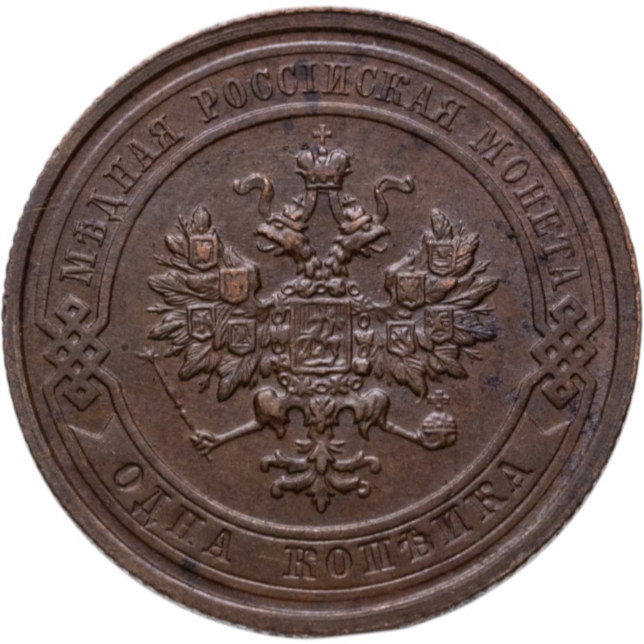 В центре монеты изображен Малый Государственный Герб Российской империи - двуглавый орел, головы которого увенчаны двумя коронами, третья, большая корона над ними. Все они соединены лентой Андрея Первозванного. В правой лапе орла – скипетр, в левой – держава. На его груди расположен Московский герб, в щите изображен Георгий Победоносец с копьем поражающий дракона. Вокруг щита цепь ордена Св. Апостола Андрея Первозванного. На крыльях орла изображены гербы: Царства Казанского, Польского, Херсонеса Таврического, Астраханского, Сибирского, Грузинского и герб соединенных княжеств Киевского, Новгородского и Владимирского — по 4 на каждое крыло. По окружности - две полукруглые плашки, соединенные узорами. На верхней плашке выпуклая надпись: "МЕДНАЯ РОССИЙСКАЯ МОНЕТА". На нижней плашке, изображенной в виде ленты, углубленная надпись: "ОДНА КОПЕЙКА".