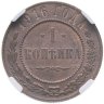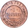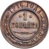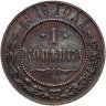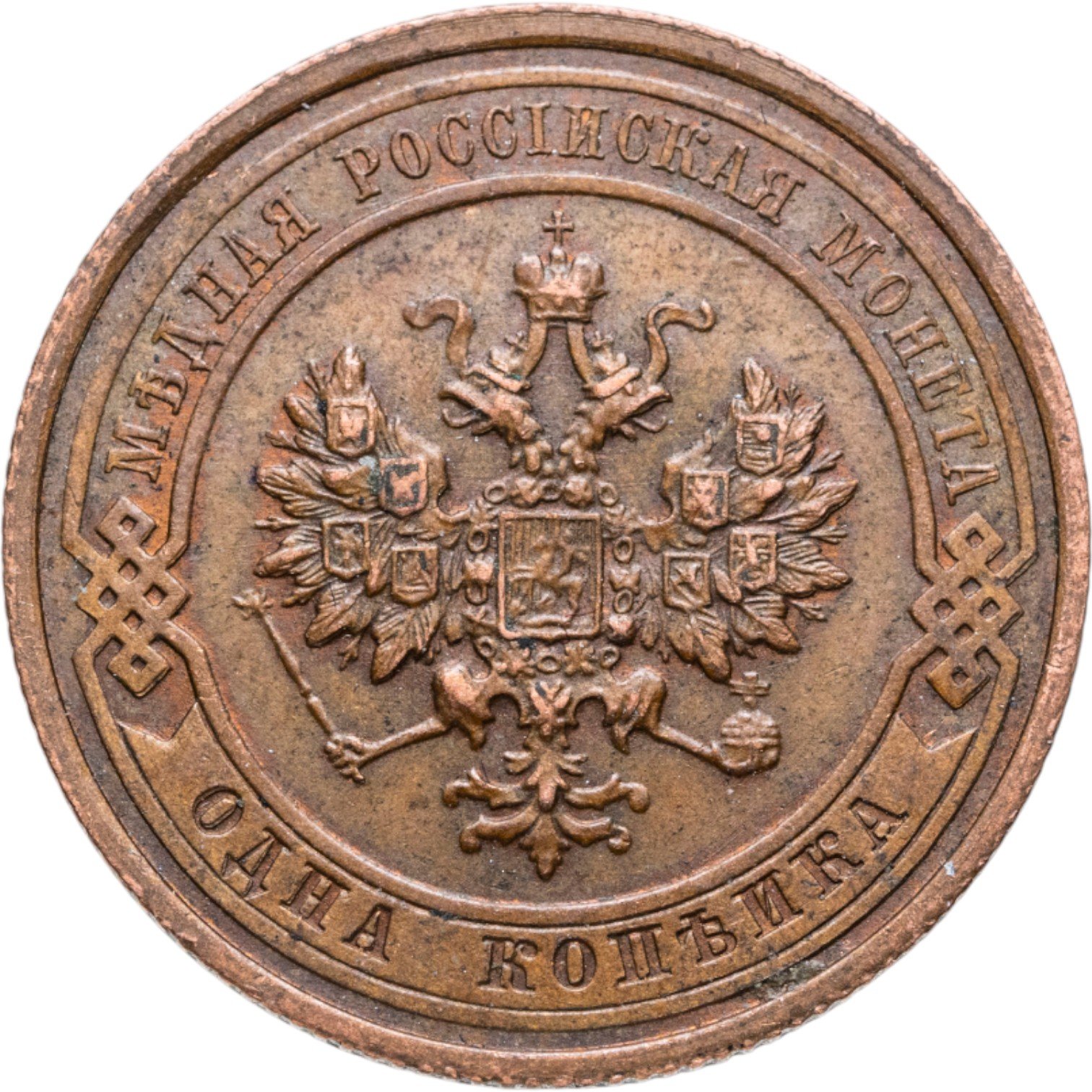 В центре монеты изображен Малый Государственный Герб Российской империи - двуглавый орел, головы которого увенчаны двумя коронами, третья, большая корона над ними. Все они соединены лентой Андрея Первозванного. В правой лапе орла – скипетр, в левой – держава. На его груди расположен Московский герб, в щите изображен Георгий Победоносец с копьем поражающий дракона. Вокруг щита цепь ордена Св. Апостола Андрея Первозванного. На крыльях орла изображены гербы: Царства Казанского, Польского, Херсонеса Таврического, Астраханского, Сибирского, Грузинского и герб соединенных княжеств Киевского, Новгородского и Владимирского — по 4 на каждое крыло. По окружности - две полукруглые плашки, соединенные узорами. На верхней плашке выпуклая надпись: "МЕДНАЯ РОССИЙСКАЯ МОНЕТА". На нижней плашке, изображенной в виде ленты, углубленная надпись: "ОДНА КОПЕЙКА".