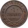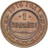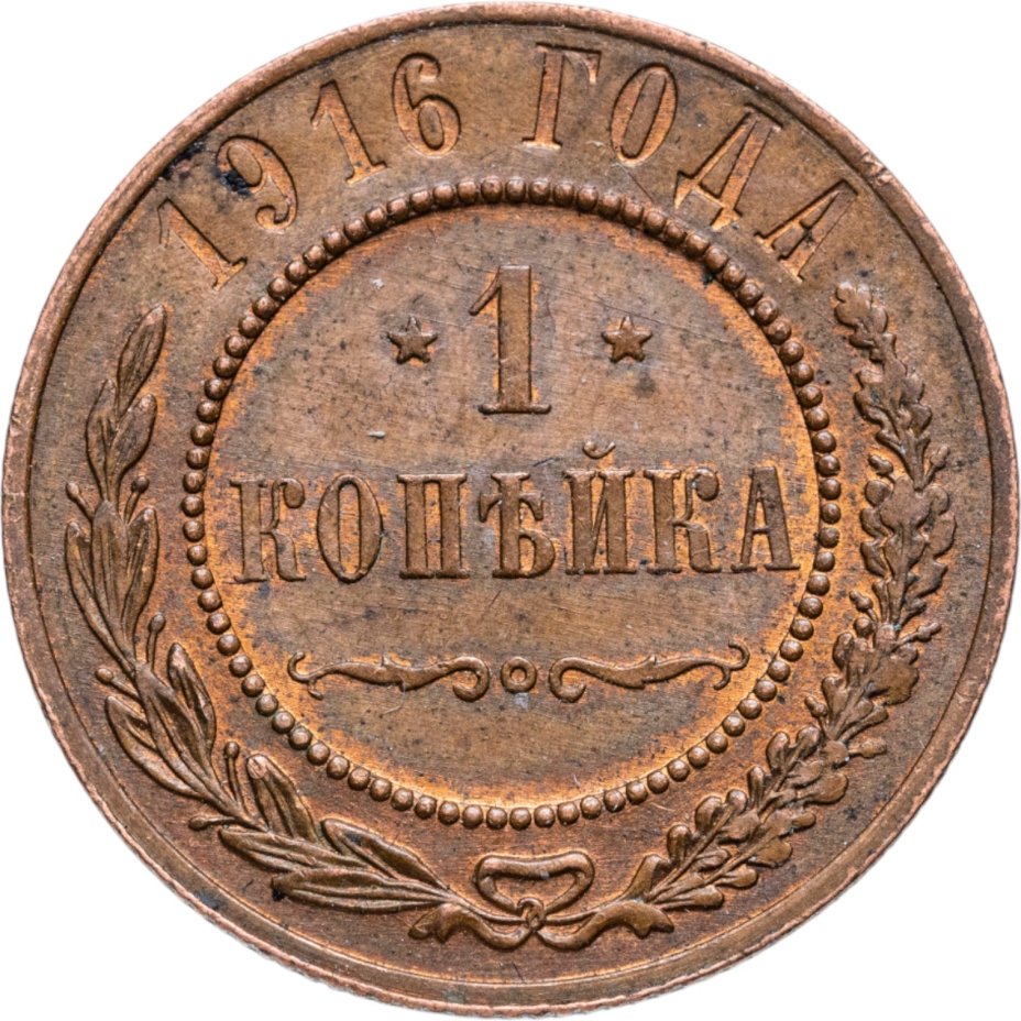 В центре указан номинал — цифра «1», ограниченная с обеих сторон звездочками. Под цифрой номинала — слово "КОПЕЙКА". Ниже, расположен декоративный разделитель в виде двух изогнутых линий и небольшой окружности между ними. Центральная часть отделена от остального изображения, окружностью в виде точек. В верхней части полукругом углубленная надпись: "1916 ГОДА". Ниже этой надписи, вдоль канта, изображен венок из лавровой и дубовой ветвей, которые, в нижней части, перевязаны лентой на узел бантом.