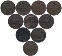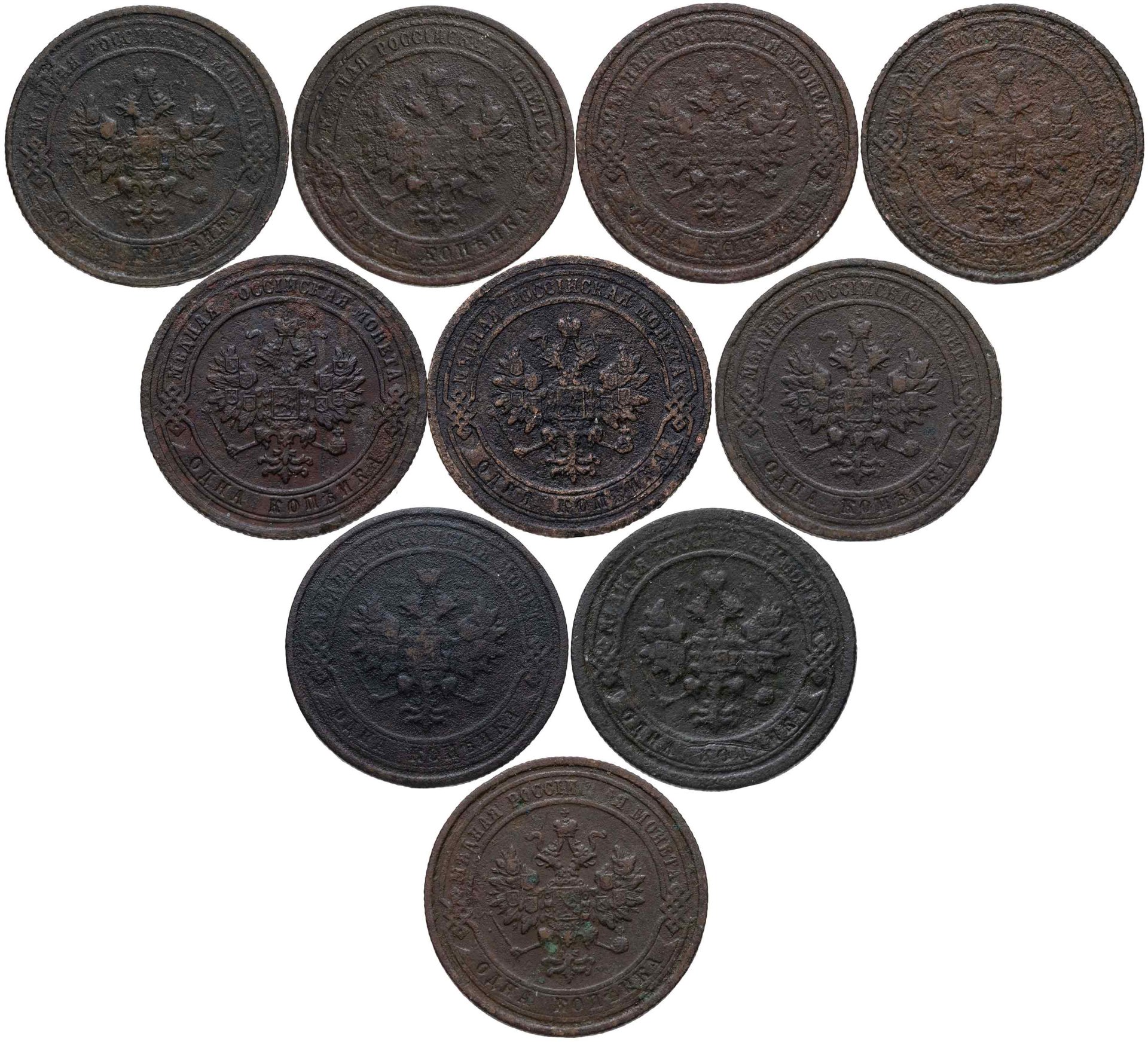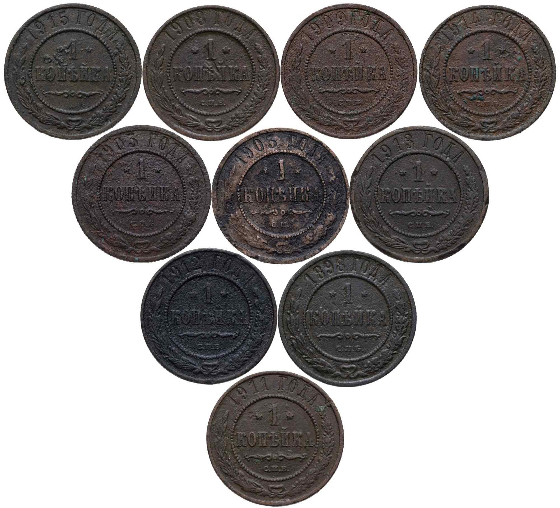 В продаже лот из 10 монет: 1 копейка 1898, 1903, 1905, 1908, 1909, 1911, 1912, 1913, 1914, 1915