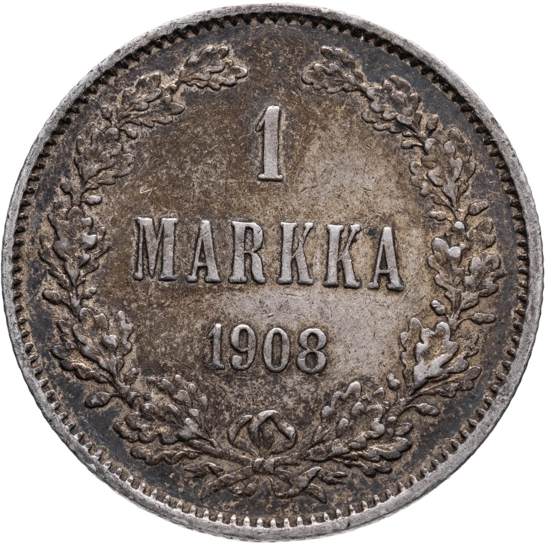 В центре - надпись в три строки: «1»│«MARKAA»│«1908». Вдоль канта изображён не замкнутый венок из двух дубовых ветвей, которые, в нижней части, перевязаны лентой на узел двойным бантом. По окружности канта имеются рельефные элементы, выполненные в виде зубцов.
