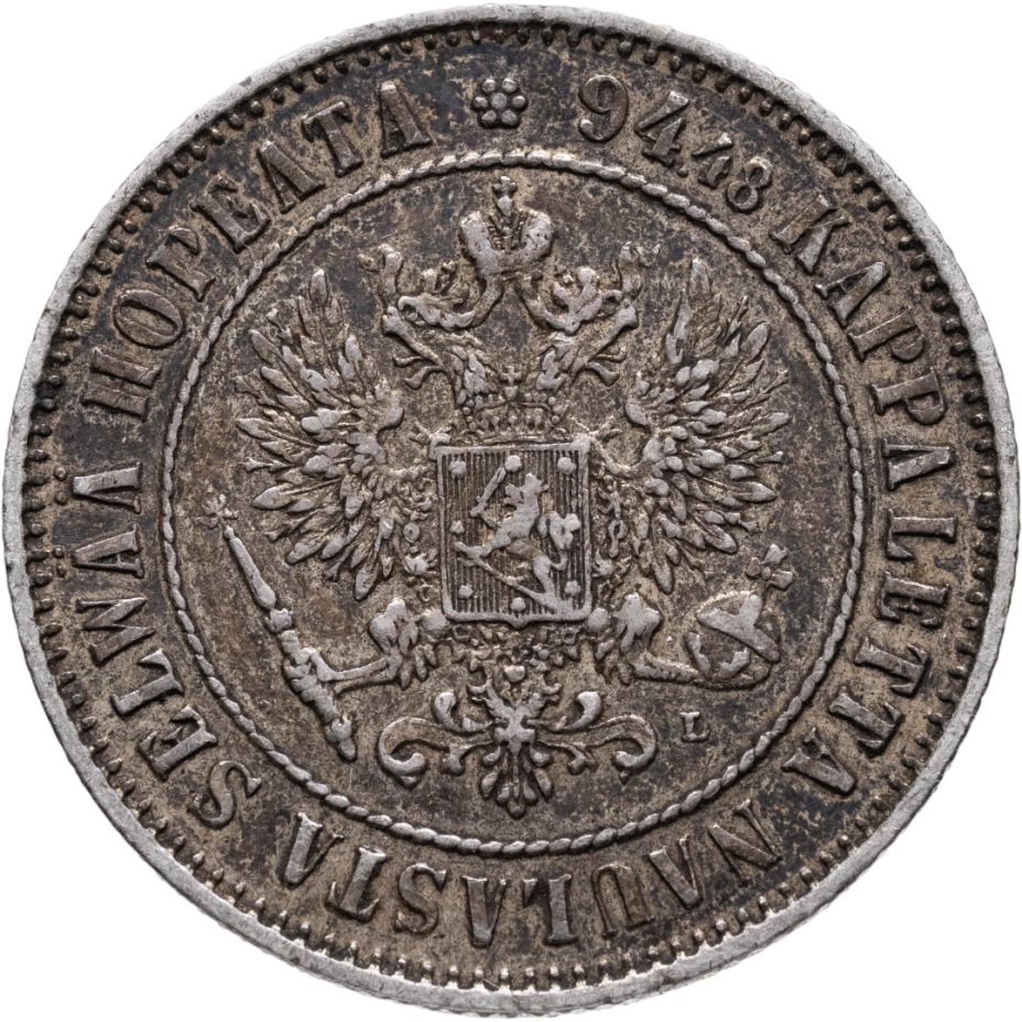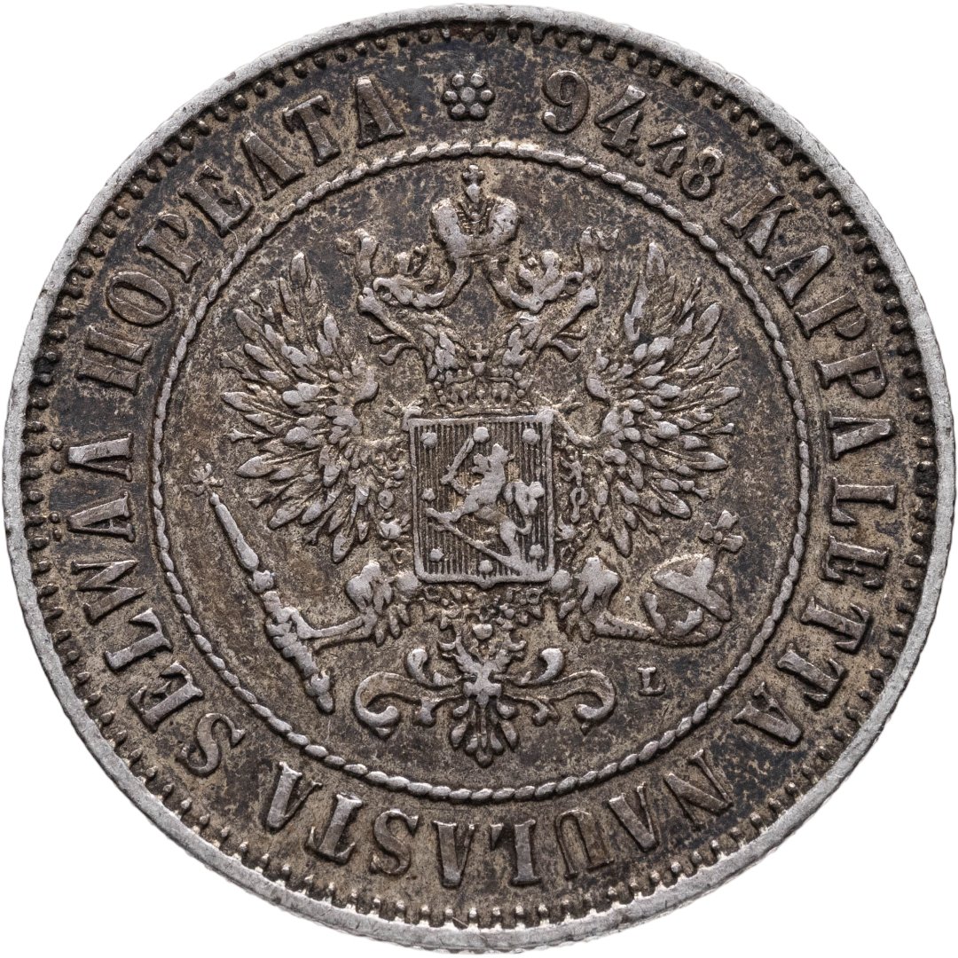 В центре изображён полный Герб Великого княжества Финляндского - двуглавый орёл, головы которого увенчаны двумя коронами, третья, большая корона над ними. Все они соединены орденской лентой ордена Св. Апостола Андрея Первозванного. На груди орла расположен щит с титульным гербом Великого князя Финляндского, увенчанный княжеской короной. Вокруг щита орденская цепь с орденом Св. Апостола Андрея Первозванного. В правой лапе орла – скипетр, в левой – держава. Под левой лапой знак директора Гельсингфосского монетного двора - литера «L», Johan Conrad Lihr (Йохан Конрад Лир). Вокруг центрального изображения - витой ободок. За ободком круговая надпись: «94.48 KAPPALETTA NAULASTA SELWÄÄ HOPEATA», сверху разделённая цветочной розеткой. По окружности канта имеются рельефные элементы, выполненные в виде зубцов.
