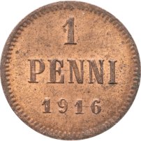 В центре надпись в три строки: «1»│«PENNI»│«1916». По окружности канта имеются рельефные элементы, выполненные в виде зубцов.