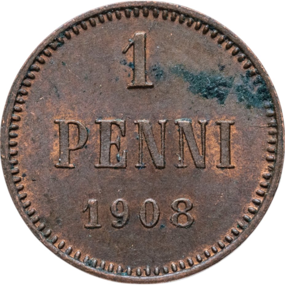В центре надпись в три строки: «1»│«PENNI»│«1908». По окружности канта имеются рельефные элементы, выполненные в виде зубцов.