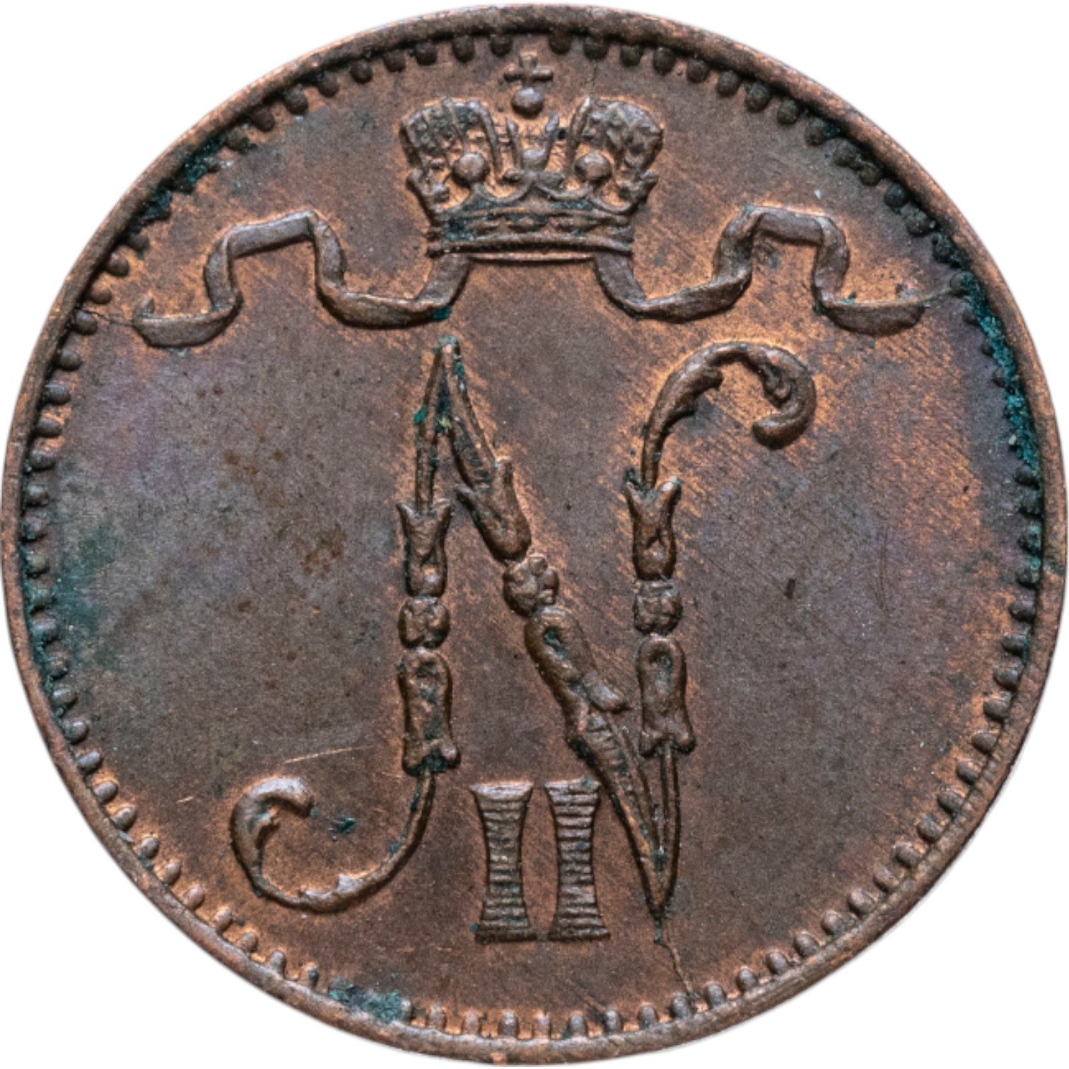 В центре вензель Николая II. Над ним императорская корона с лентами ордена Св. Апостола Андрея Первозванного. По окружности канта имеются рельефные элементы, выполненные в виде зубцов.