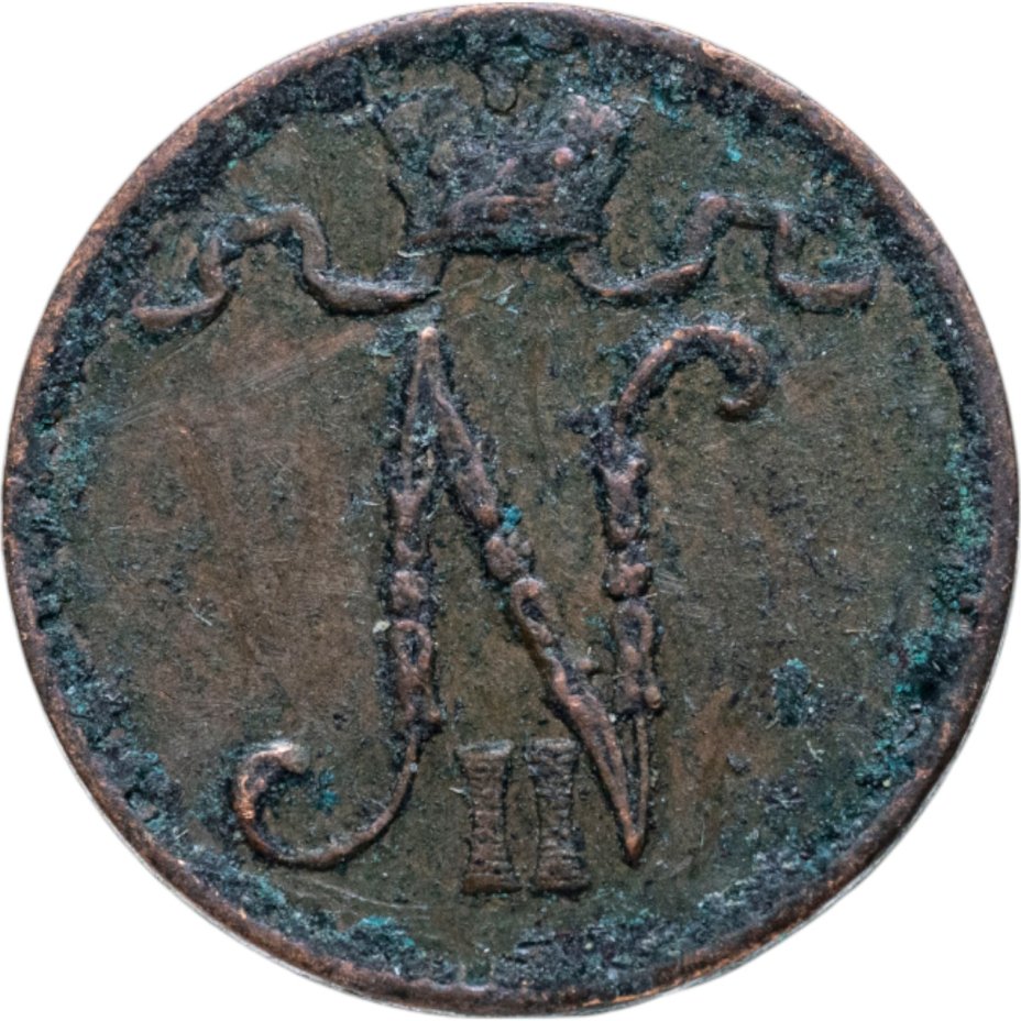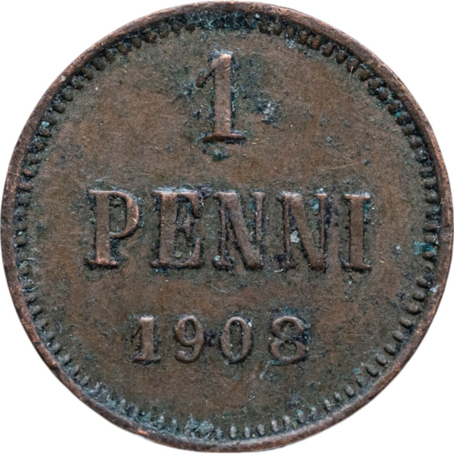 В центре надпись в три строки: «1»│«PENNI»│«1908». По окружности канта имеются рельефные элементы, выполненные в виде зубцов.