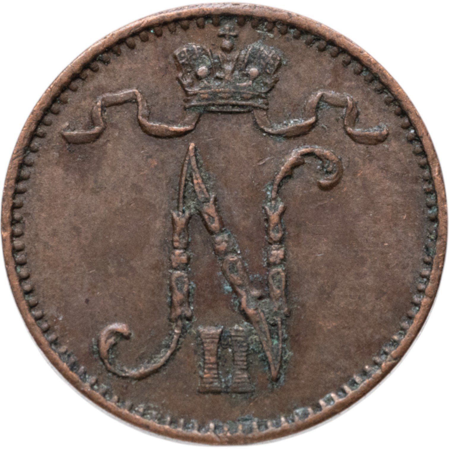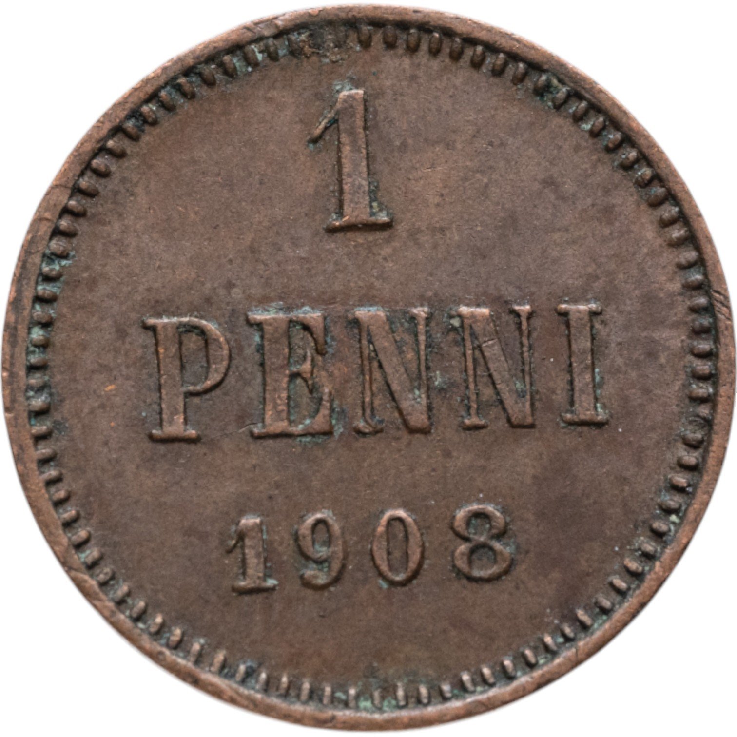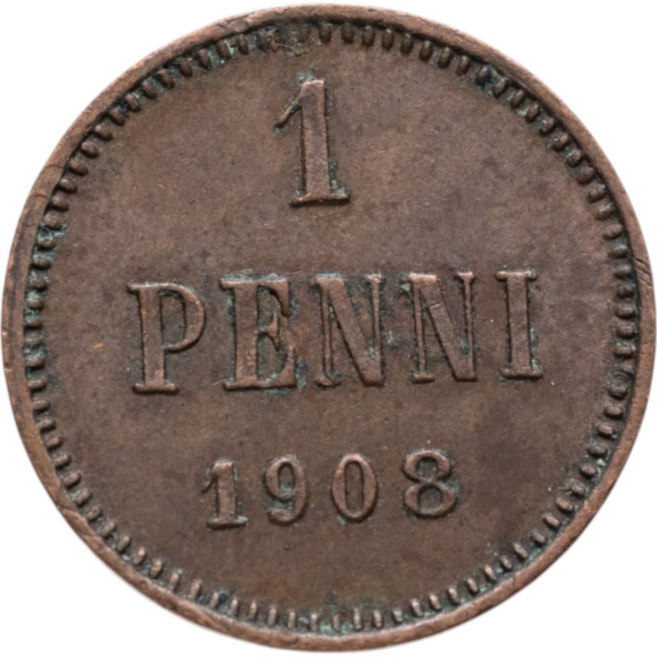 В центре надпись в три строки: «1»│«PENNI»│«1908». По окружности канта имеются рельефные элементы, выполненные в виде зубцов.