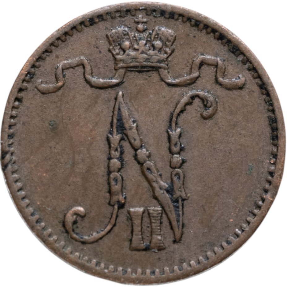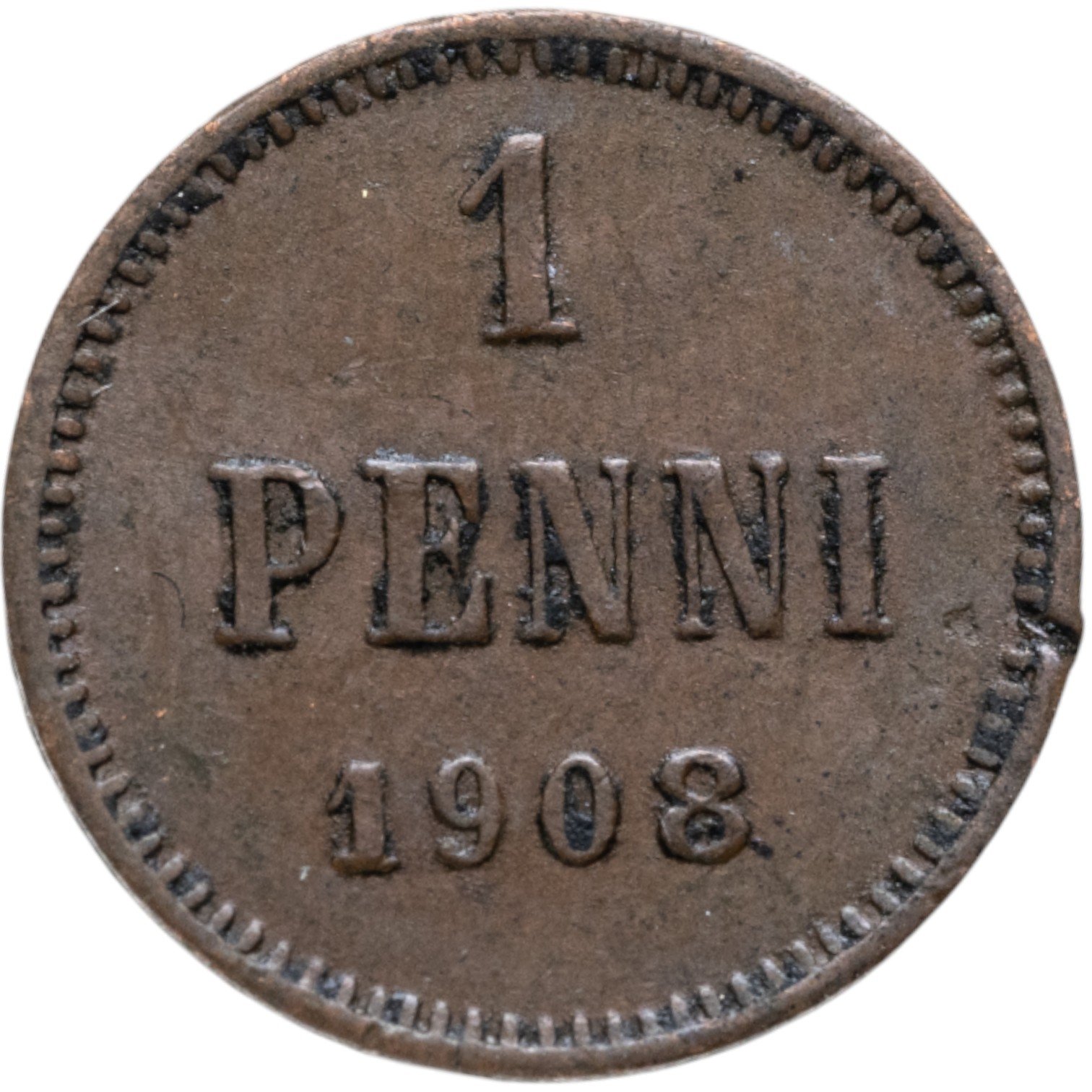 В центре надпись в три строки: «1»│«PENNI»│«1908». По окружности канта имеются рельефные элементы, выполненные в виде зубцов.
