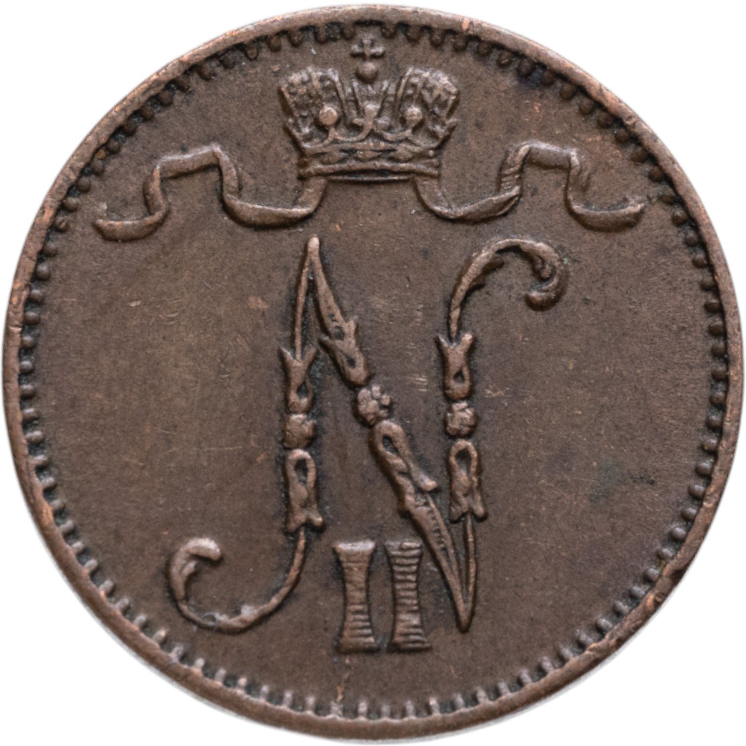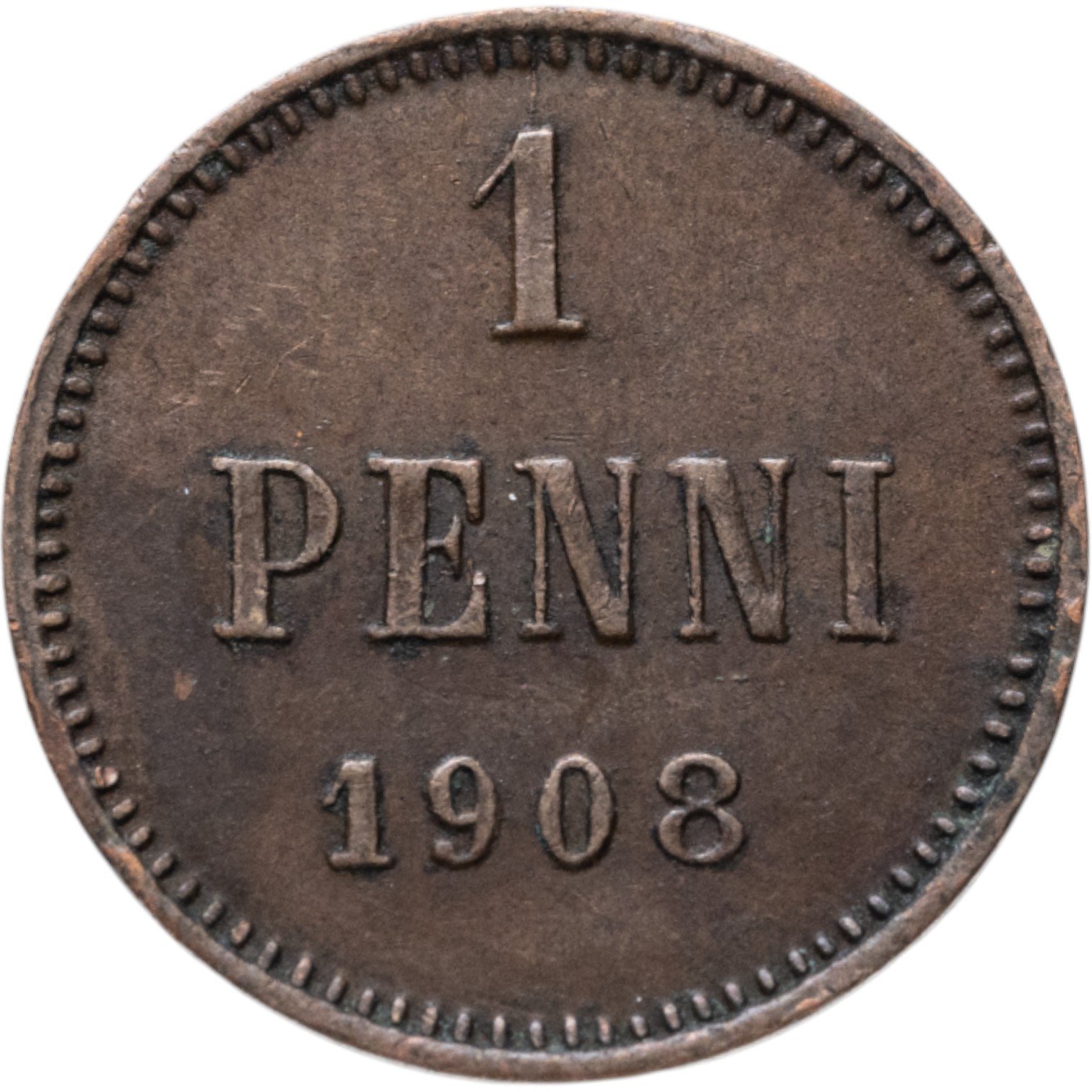 В центре надпись в три строки: «1»│«PENNI»│«1908». По окружности канта имеются рельефные элементы, выполненные в виде зубцов.