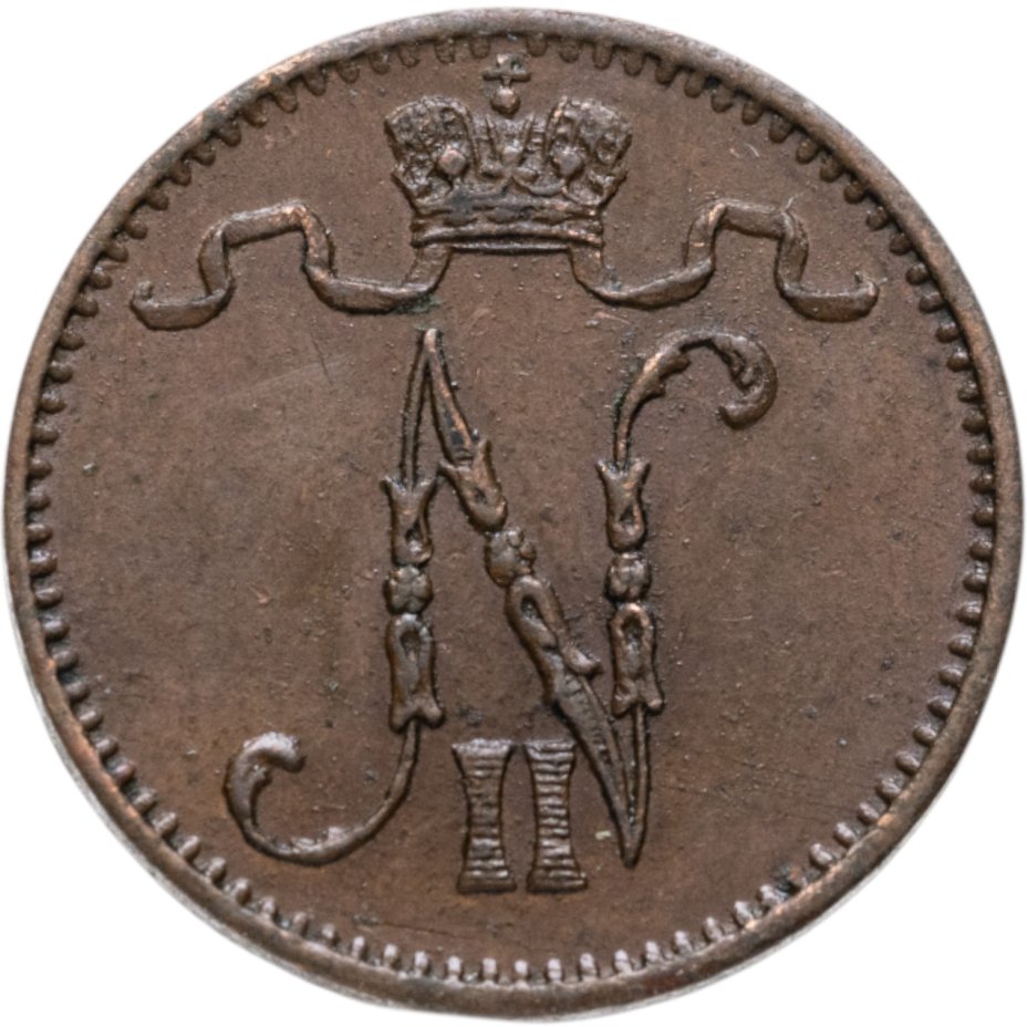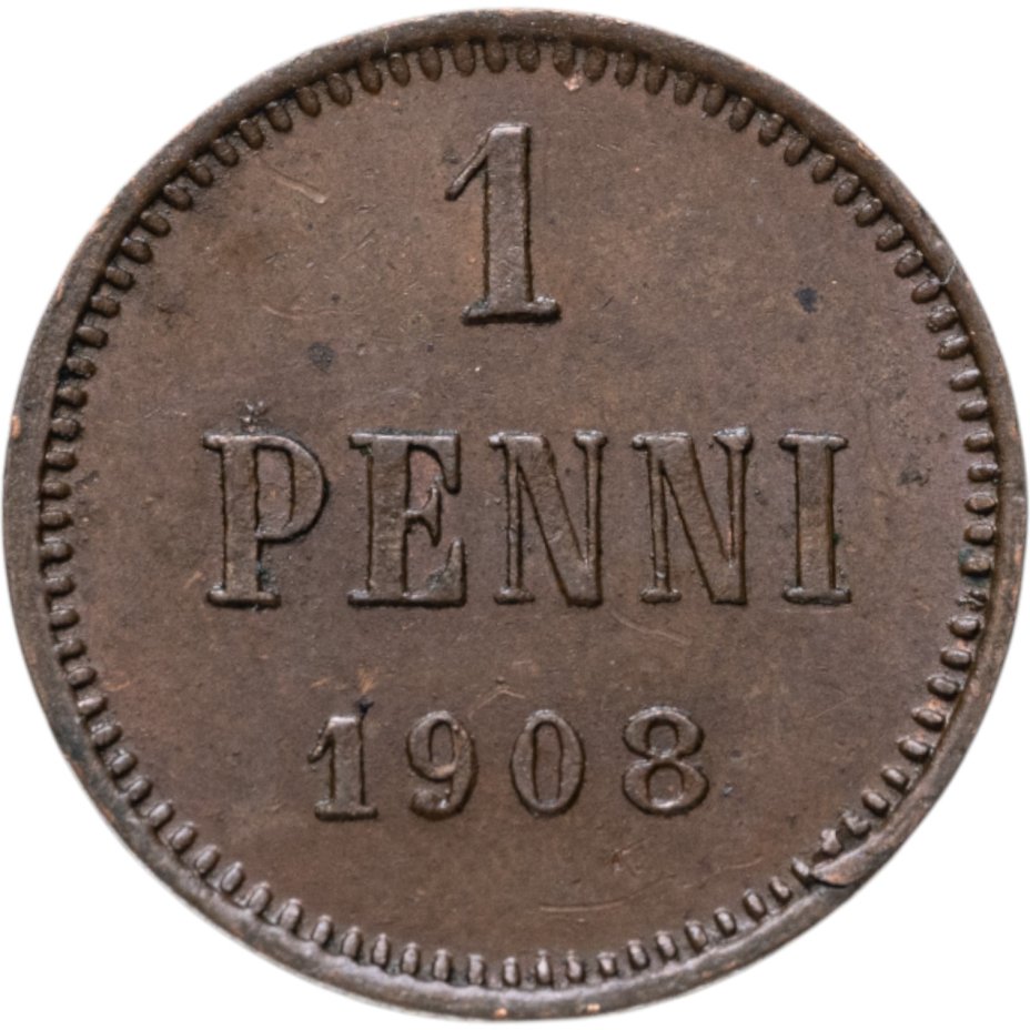 В центре надпись в три строки: «1»│«PENNI»│«1908». По окружности канта имеются рельефные элементы, выполненные в виде зубцов.