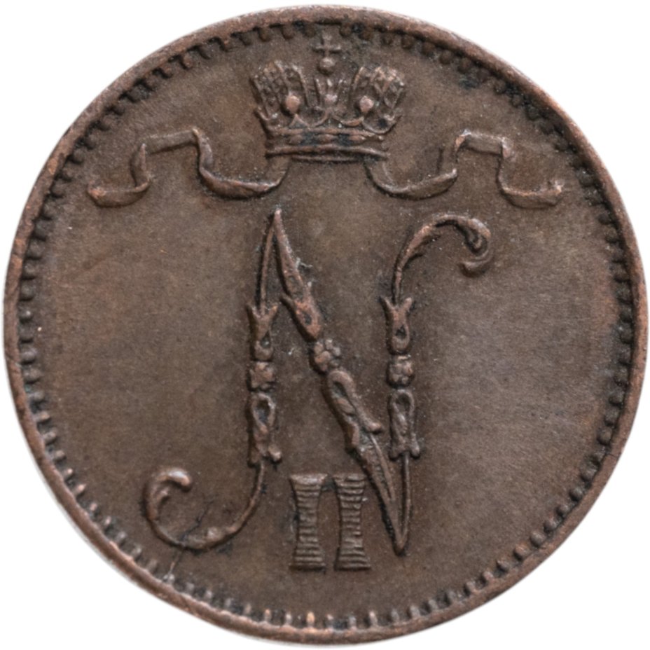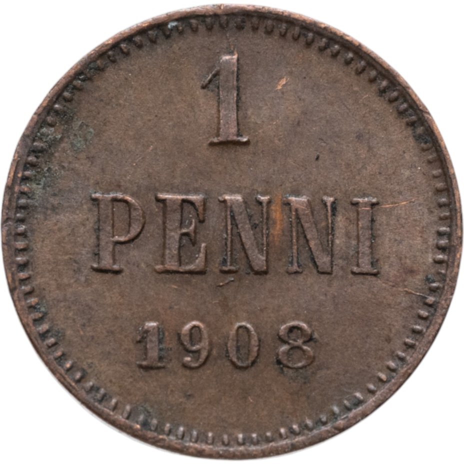 В центре надпись в три строки: «1»│«PENNI»│«1908». По окружности канта имеются рельефные элементы, выполненные в виде зубцов.