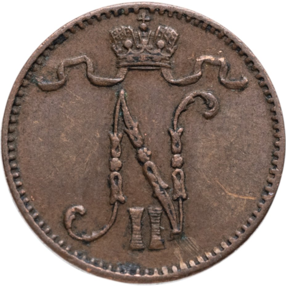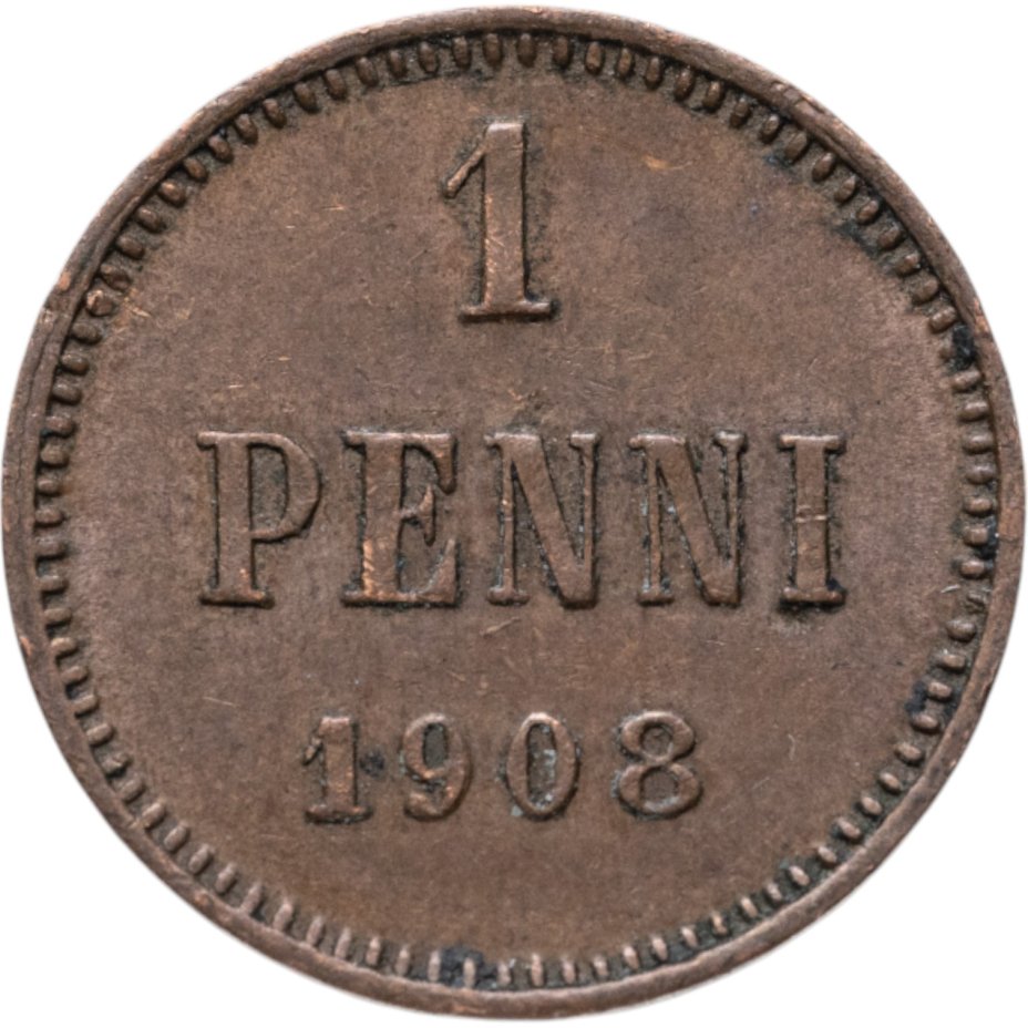 В центре надпись в три строки: «1»│«PENNI»│«1908». По окружности канта имеются рельефные элементы, выполненные в виде зубцов.