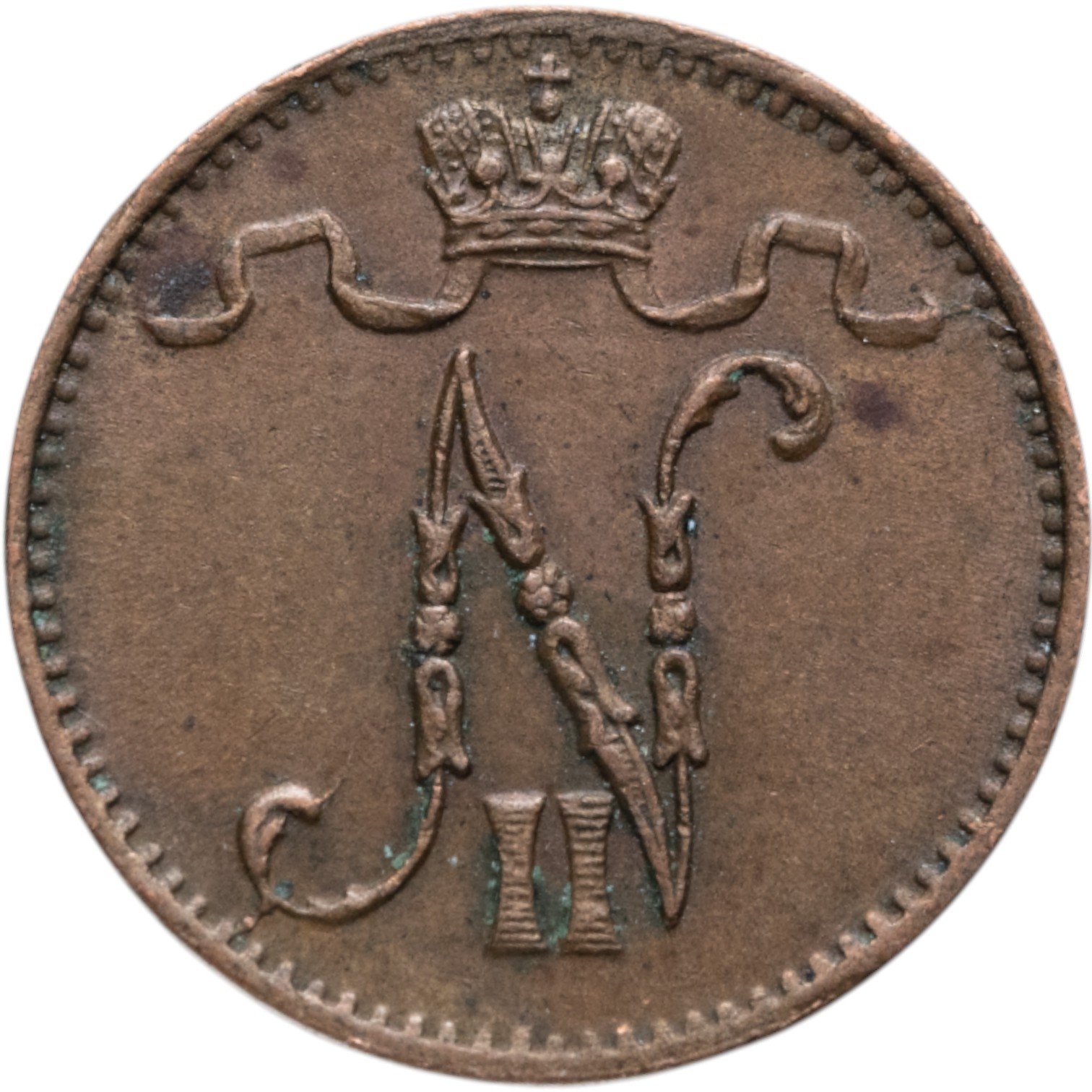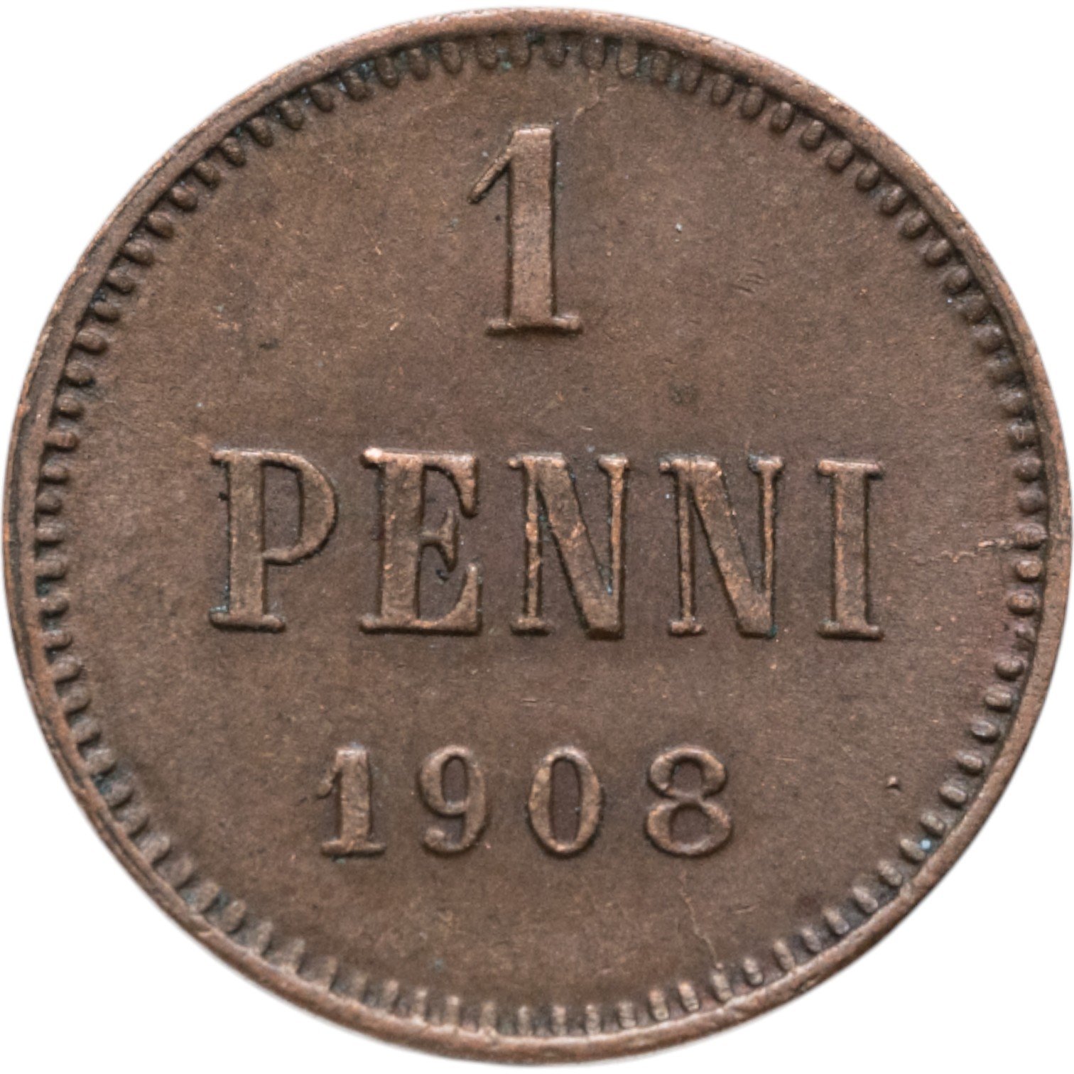 В центре надпись в три строки: «1»│«PENNI»│«1908». По окружности канта имеются рельефные элементы, выполненные в виде зубцов.