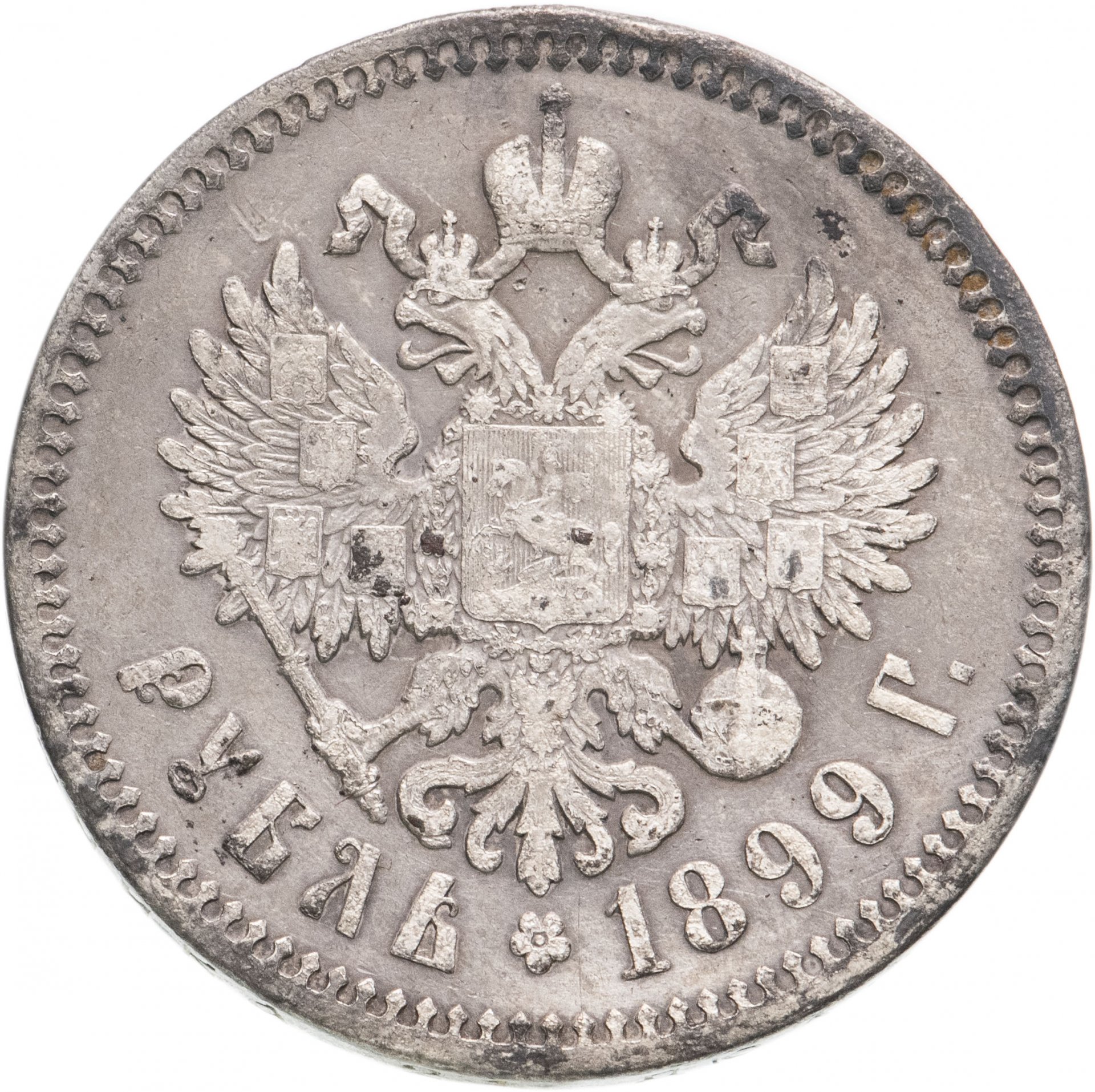 В центре изображен Малый Государственный Герб Российской империи - двуглавый орёл, головы которого увенчаны двумя коронами, третья, большая корона над ними. Все они соединены орденской лентой ордена Св. Апостола Андрея Первозванного. На груди орла расположен Московский герб, в щите изображен Георгий Победоносец с копьем поражающий дракона. Вокруг щита цепь ордена Св. Апостола Андрея Первозванного. На крыльях изображены гербы: Царства Казанского, Польского, Херсонеса Таврического, Астраханского, Сибирского, Грузинского и герб соединенных княжеств Киевского, Новгородского и Владимирского — по 4 на каждое крыло. В правой лапе орла – скипетр, в левой – держава. Под ним слева направо изображены: номинал - надпись «РУБЛЬ», цветочная розетка и дата выпуска «1899 Г.». По окружности канта имеются рельефные элементы, выполненные в виде зубцов.