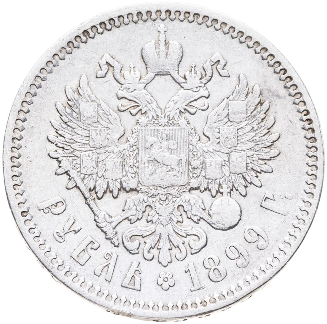 В центре изображен Малый Государственный Герб Российской империи - двуглавый орёл, головы которого увенчаны двумя коронами, третья, большая корона над ними. Все они соединены орденской лентой ордена Св. Апостола Андрея Первозванного. На груди орла расположен Московский герб, в щите изображен Георгий Победоносец с копьем поражающий дракона. Вокруг щита цепь ордена Св. Апостола Андрея Первозванного. На крыльях изображены гербы: Царства Казанского, Польского, Херсонеса Таврического, Астраханского, Сибирского, Грузинского и герб соединенных княжеств Киевского, Новгородского и Владимирского — по 4 на каждое крыло. В правой лапе орла – скипетр, в левой – держава. Под ним слева направо изображены: номинал - надпись «РУБЛЬ», цветочная розетка и дата выпуска «1899 Г.». По окружности канта имеются рельефные элементы, выполненные в виде зубцов.
