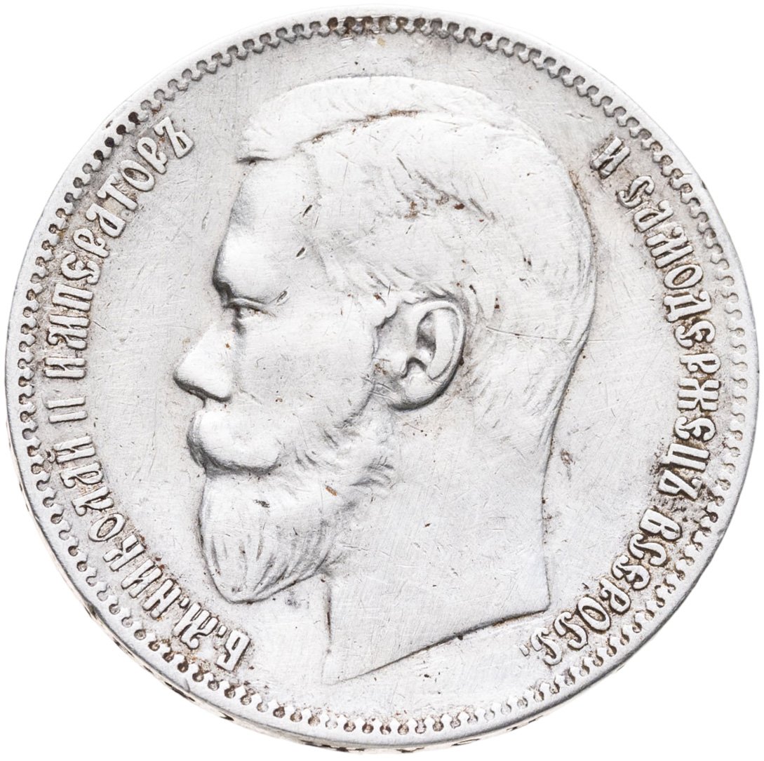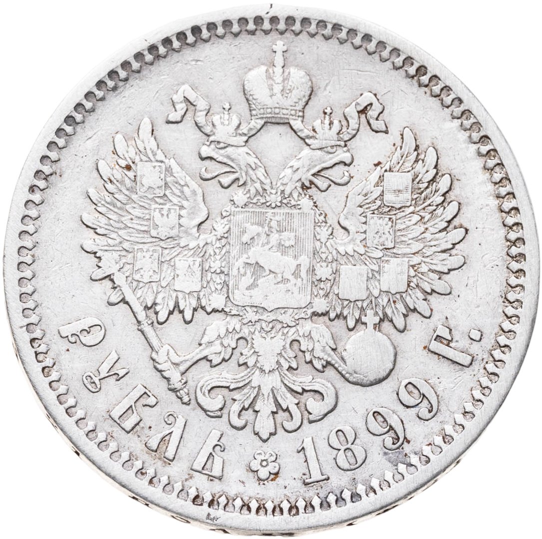 В центре изображен Малый Государственный Герб Российской империи - двуглавый орёл, головы которого увенчаны двумя коронами, третья, большая корона над ними. Все они соединены орденской лентой ордена Св. Апостола Андрея Первозванного. На груди орла расположен Московский герб, в щите изображен Георгий Победоносец с копьем поражающий дракона. Вокруг щита цепь ордена Св. Апостола Андрея Первозванного. На крыльях изображены гербы: Царства Казанского, Польского, Херсонеса Таврического, Астраханского, Сибирского, Грузинского и герб соединенных княжеств Киевского, Новгородского и Владимирского — по 4 на каждое крыло. В правой лапе орла – скипетр, в левой – держава. Под ним слева направо изображены: номинал - надпись «РУБЛЬ», цветочная розетка и дата выпуска «1899 Г.». По окружности канта имеются рельефные элементы, выполненные в виде зубцов.