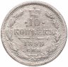 В центре указан номинал «10», ограниченный с обеих сторон звездочками. Над цифрой – Корона Российской империи. Под цифрой номинала — слово "КОПЕЕК". Ниже, расположен декоративный разделитель в виде двух разнонаправленных фигурных линий и стилизованным из точек крестом между ними. Под разделителем — дата выпуска монеты «1895». Под цифрой даты — обозначение монетного двора «С.П.Б.». Вдоль канта, не доходя до короны, изображен венок из лавровой и дубовой ветви, которые в нижней части перевязаны лентой на узел бантом. По окружности канта имеются рельефные элементы, выполненные в виде зубцов.