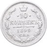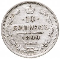 В центре указан номинал «10», ограниченный с обеих сторон звездочками. Над цифрой – Корона Российской империи. Под цифрой номинала — слово "КОПЕЕК". Ниже, расположен декоративный разделитель в виде двух разнонаправленных фигурных линий и стилизованным из точек крестом между ними. Под разделителем — дата выпуска монеты «1899». Под цифрой даты — обозначение монетного двора «С.П.Б.». Вдоль канта, не доходя до короны, изображен венок из лавровой и дубовой ветви, которые в нижней части перевязаны лентой на узел бантом. По окружности канта имеются рельефные элементы, выполненные в виде зубцов.
