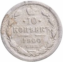 В центре указан номинал «10», ограниченный с обеих сторон звездочками. Над цифрой – Корона Российской империи. Под цифрой номинала — слово "КОПЕЕК". Ниже, расположен декоративный разделитель в виде двух разнонаправленных фигурных линий и стилизованным из точек крестом между ними. Под разделителем — дата выпуска монеты «1900». Под цифрой даты — обозначение монетного двора «С.П.Б.». Вдоль канта, не доходя до короны, изображен венок из лавровой и дубовой ветви, которые в нижней части перевязаны лентой на узел бантом. По окружности канта имеются рельефные элементы, выполненные в виде зубцов.