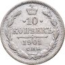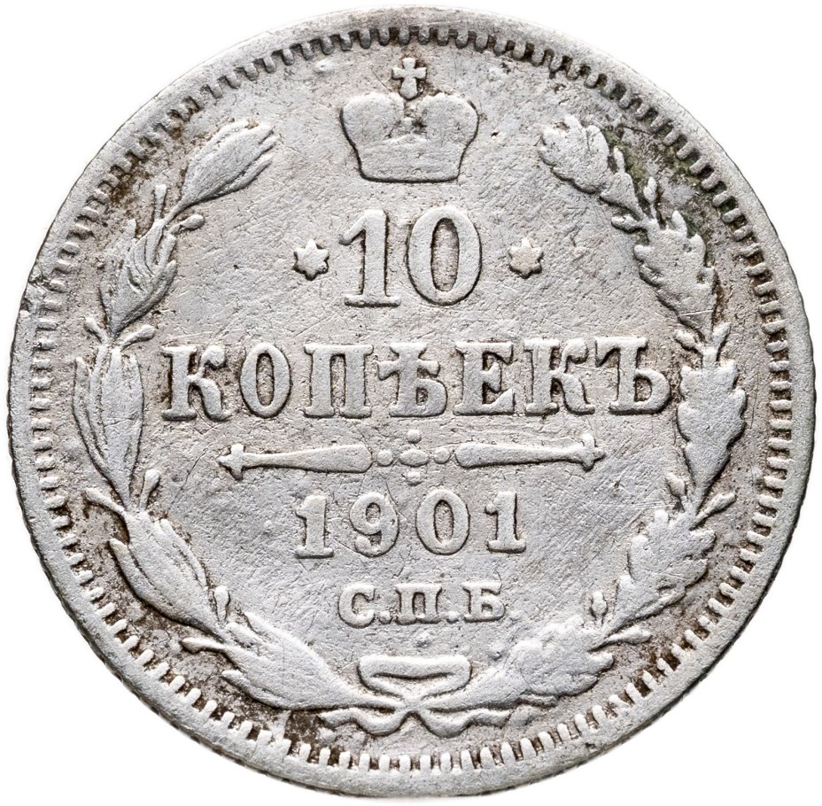 В центре указан номинал «10», ограниченный с обеих сторон звездочками. Над цифрой – Корона Российской империи. Под цифрой номинала — слово "КОПЕЕК". Ниже, расположен декоративный разделитель в виде двух разнонаправленных фигурных линий и стилизованным из точек крестом между ними. Под разделителем — дата выпуска монеты «1901». Под цифрой даты — обозначение монетного двора «С.П.Б.». Вдоль канта, не доходя до короны, изображен венок из лавровой и дубовой ветви, которые в нижней части перевязаны лентой на узел бантом. По окружности канта имеются рельефные элементы, выполненные в виде зубцов.