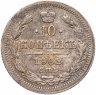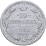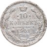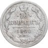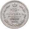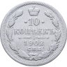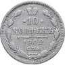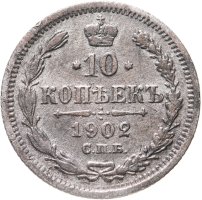 В центре указан номинал «10», ограниченный с обеих сторон звездочками. Над цифрой – Корона Российской империи. Под цифрой номинала — слово "КОПЕЕК". Ниже, расположен декоративный разделитель в виде двух разнонаправленных фигурных линий и стилизованным из точек крестом между ними. Под разделителем — дата выпуска монеты «1902». Под цифрой даты — обозначение монетного двора «С.П.Б.». Вдоль канта, не доходя до короны, изображен венок из лавровой и дубовой ветви, которые в нижней части перевязаны лентой на узел бантом. По окружности канта имеются рельефные элементы, выполненные в виде зубцов.