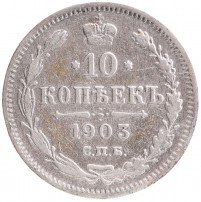 В центре указан номинал «10», ограниченный с обеих сторон звездочками. Над цифрой – Корона Российской империи. Под цифрой номинала — слово "КОПЕЕК". Ниже, расположен декоративный разделитель в виде двух разнонаправленных фигурных линий и стилизованным из точек крестом между ними. Под разделителем — дата выпуска монеты «1903». Под цифрой даты — обозначение монетного двора «С.П.Б.». Вдоль канта, не доходя до короны, изображен венок из лавровой и дубовой ветви, которые в нижней части перевязаны лентой на узел бантом. По окружности канта имеются рельефные элементы, выполненные в виде зубцов.