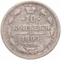 В центре указан номинал «10», ограниченный с обеих сторон звездочками. Над цифрой – Корона Российской империи. Под цифрой номинала — слово "КОПЕЕК". Ниже, расположен декоративный разделитель в виде двух разнонаправленных фигурных линий и стилизованным из точек крестом между ними. Под разделителем — дата выпуска монеты «1904». Под цифрой даты — обозначение монетного двора «С.П.Б.». Вдоль канта, не доходя до короны, изображен венок из лавровой и дубовой ветви, которые в нижней части перевязаны лентой на узел бантом. По окружности канта имеются рельефные элементы, выполненные в виде зубцов.