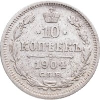 В центре указан номинал «10», ограниченный с обеих сторон звездочками. Над цифрой – Корона Российской империи. Под цифрой номинала — слово "КОПЕЕК". Ниже, расположен декоративный разделитель в виде двух разнонаправленных фигурных линий и стилизованным из точек крестом между ними. Под разделителем — дата выпуска монеты «1904». Под цифрой даты — обозначение монетного двора «С.П.Б.». Вдоль канта, не доходя до короны, изображен венок из лавровой и дубовой ветви, которые в нижней части перевязаны лентой на узел бантом. По окружности канта имеются рельефные элементы, выполненные в виде зубцов.