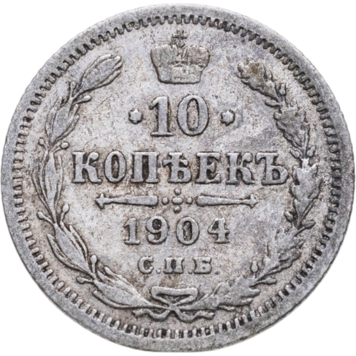 В центре указан номинал «10», ограниченный с обеих сторон звездочками. Над цифрой – Корона Российской империи. Под цифрой номинала — слово "КОПЕЕК". Ниже, расположен декоративный разделитель в виде двух разнонаправленных фигурных линий и стилизованным из точек крестом между ними. Под разделителем — дата выпуска монеты «1904». Под цифрой даты — обозначение монетного двора «С.П.Б.». Вдоль канта, не доходя до короны, изображен венок из лавровой и дубовой ветви, которые в нижней части перевязаны лентой на узел бантом. По окружности канта имеются рельефные элементы, выполненные в виде зубцов.