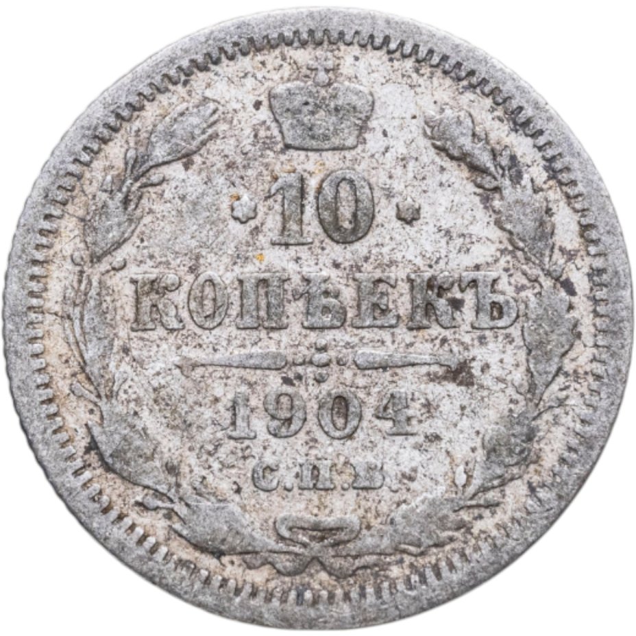 В центре указан номинал «10», ограниченный с обеих сторон звездочками. Над цифрой – Корона Российской империи. Под цифрой номинала — слово "КОПЕЕК". Ниже, расположен декоративный разделитель в виде двух разнонаправленных фигурных линий и стилизованным из точек крестом между ними. Под разделителем — дата выпуска монеты «1904». Под цифрой даты — обозначение монетного двора «С.П.Б.». Вдоль канта, не доходя до короны, изображен венок из лавровой и дубовой ветви, которые в нижней части перевязаны лентой на узел бантом. По окружности канта имеются рельефные элементы, выполненные в виде зубцов.