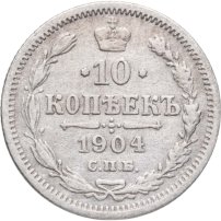 В центре указан номинал «10», ограниченный с обеих сторон звездочками. Над цифрой – Корона Российской империи. Под цифрой номинала — слово "КОПЕЕК". Ниже, расположен декоративный разделитель в виде двух разнонаправленных фигурных линий и стилизованным из точек крестом между ними. Под разделителем — дата выпуска монеты «1904». Под цифрой даты — обозначение монетного двора «С.П.Б.». Вдоль канта, не доходя до короны, изображен венок из лавровой и дубовой ветви, которые в нижней части перевязаны лентой на узел бантом. По окружности канта имеются рельефные элементы, выполненные в виде зубцов.