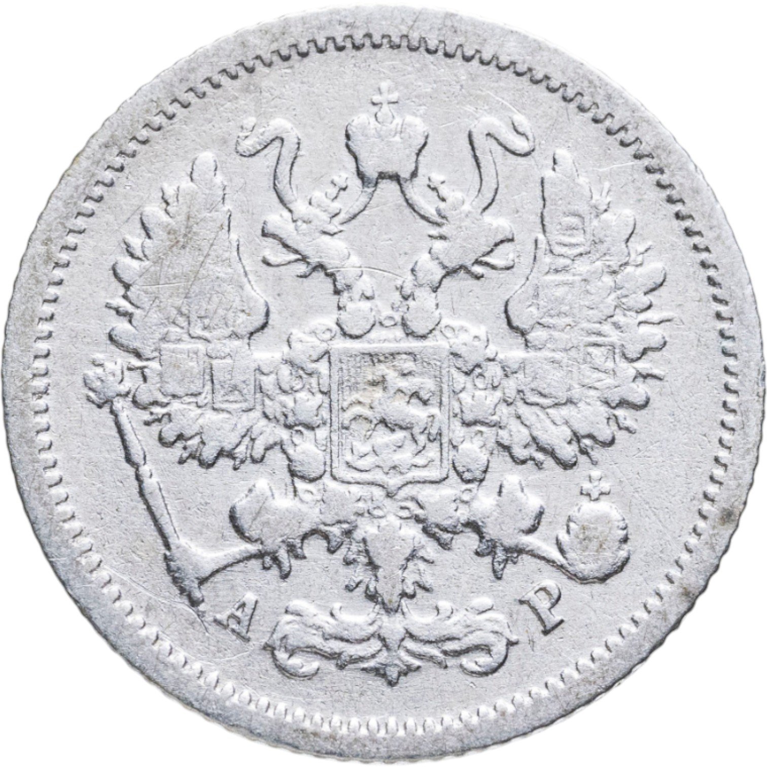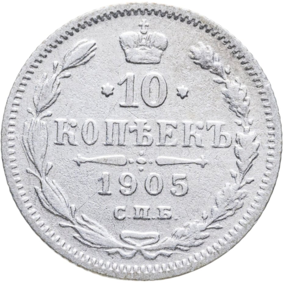В центре указан номинал «10», ограниченный с обеих сторон звездочками. Над цифрой – Корона Российской империи. Под цифрой номинала — слово "КОПЕЕК". Ниже, расположен декоративный разделитель в виде двух разнонаправленных фигурных линий и стилизованным из точек крестом между ними. Под разделителем — дата выпуска монеты «1905». Под цифрой даты — обозначение монетного двора «С.П.Б.». Вдоль канта, не доходя до короны, изображен венок из лавровой и дубовой ветви, которые в нижней части перевязаны лентой на узел бантом. По окружности канта имеются рельефные элементы, выполненные в виде зубцов.