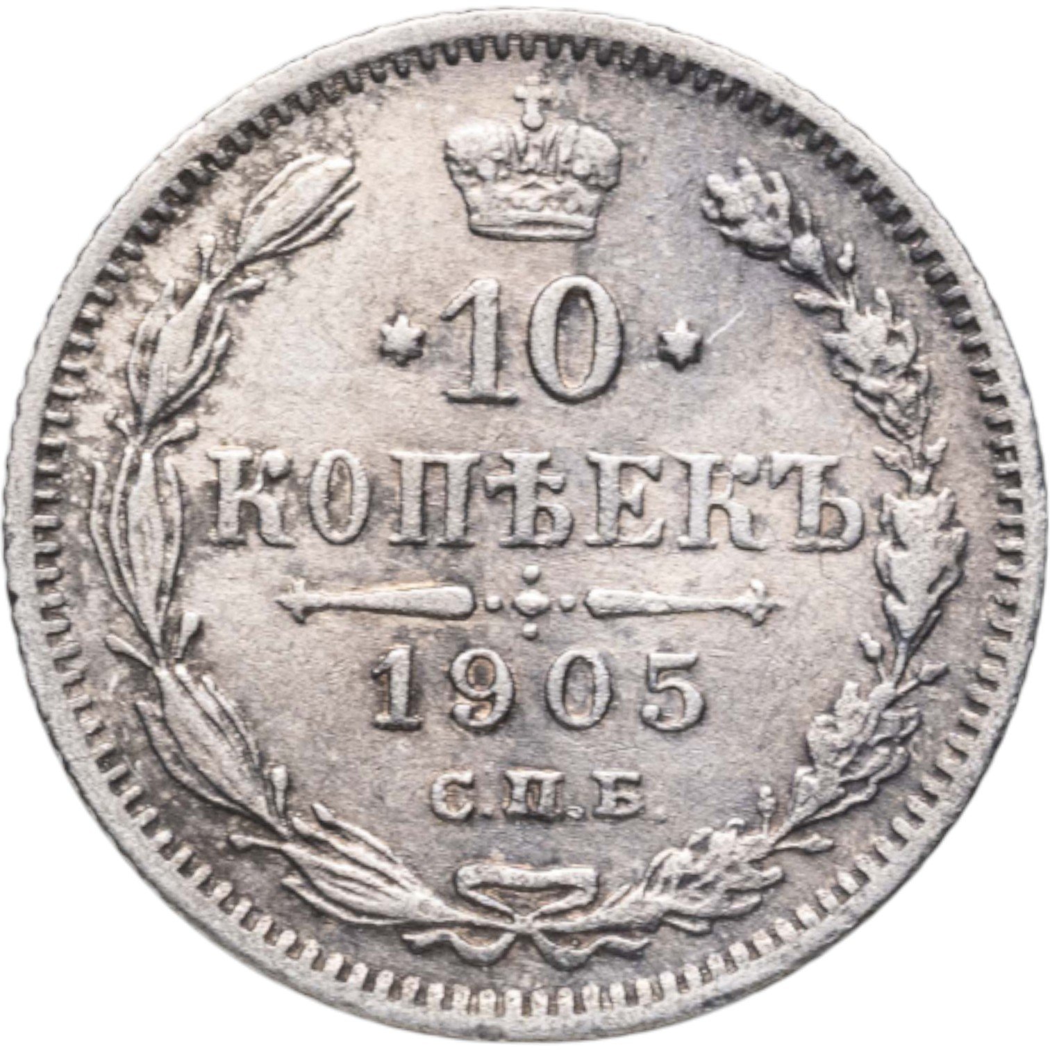 В центре указан номинал «10», ограниченный с обеих сторон звездочками. Над цифрой – Корона Российской империи. Под цифрой номинала — слово "КОПЕЕК". Ниже, расположен декоративный разделитель в виде двух разнонаправленных фигурных линий и стилизованным из точек крестом между ними. Под разделителем — дата выпуска монеты «1905». Под цифрой даты — обозначение монетного двора «С.П.Б.». Вдоль канта, не доходя до короны, изображен венок из лавровой и дубовой ветви, которые в нижней части перевязаны лентой на узел бантом. По окружности канта имеются рельефные элементы, выполненные в виде зубцов.