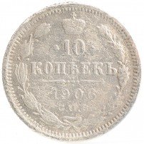 В центре указан номинал «10», ограниченный с обеих сторон звездочками. Над цифрой – Корона Российской империи. Под цифрой номинала — слово "КОПЕЕК". Ниже, расположен декоративный разделитель в виде двух разнонаправленных фигурных линий и стилизованным из точек крестом между ними. Под разделителем — дата выпуска монеты «1906». Под цифрой даты — обозначение монетного двора «С.П.Б.». Вдоль канта, не доходя до короны, изображен венок из лавровой и дубовой ветви, которые в нижней части перевязаны лентой на узел бантом. По окружности канта имеются рельефные элементы, выполненные в виде зубцов.