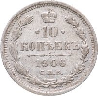 В центре указан номинал «10», ограниченный с обеих сторон звездочками. Над цифрой – Корона Российской империи. Под цифрой номинала — слово "КОПЕЕК". Ниже, расположен декоративный разделитель в виде двух разнонаправленных фигурных линий и стилизованным из точек крестом между ними. Под разделителем — дата выпуска монеты «1906». Под цифрой даты — обозначение монетного двора «С.П.Б.». Вдоль канта, не доходя до короны, изображен венок из лавровой и дубовой ветви, которые в нижней части перевязаны лентой на узел бантом. По окружности канта имеются рельефные элементы, выполненные в виде зубцов.