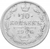 В центре указан номинал «10», ограниченный с обеих сторон звездочками. Над цифрой – Корона Российской империи. Под цифрой номинала — слово "КОПЕЕК". Ниже, расположен декоративный разделитель в виде двух разнонаправленных фигурных линий и стилизованным из точек крестом между ними. Под разделителем — дата выпуска монеты «1906». Под цифрой даты — обозначение монетного двора «С.П.Б.». Вдоль канта, не доходя до короны, изображен венок из лавровой и дубовой ветви, которые в нижней части перевязаны лентой на узел бантом. По окружности канта имеются рельефные элементы, выполненные в виде зубцов.