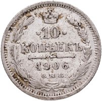 В центре указан номинал «10», ограниченный с обеих сторон звездочками. Над цифрой – Корона Российской империи. Под цифрой номинала — слово "КОПЕЕК". Ниже, расположен декоративный разделитель в виде двух разнонаправленных фигурных линий и стилизованным из точек крестом между ними. Под разделителем — дата выпуска монеты «1906». Под цифрой даты — обозначение монетного двора «С.П.Б.». Вдоль канта, не доходя до короны, изображен венок из лавровой и дубовой ветви, которые в нижней части перевязаны лентой на узел бантом. По окружности канта имеются рельефные элементы, выполненные в виде зубцов.