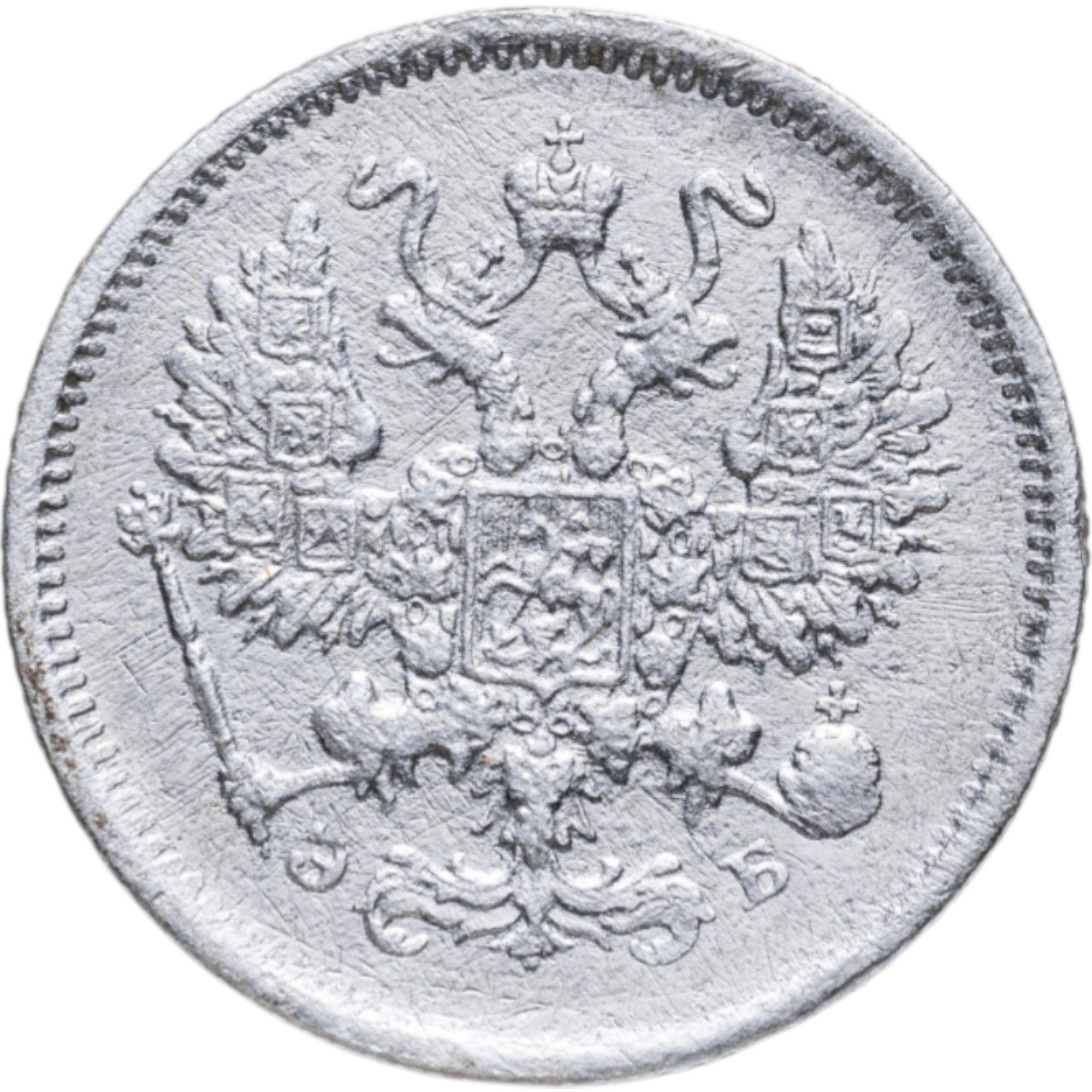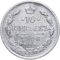 В центре указан номинал «10», ограниченный с обеих сторон звездочками. Над цифрой – Корона Российской империи. Под цифрой номинала — слово "КОПЕЕК". Ниже, расположен декоративный разделитель в виде двух разнонаправленных фигурных линий и стилизованным из точек крестом между ними. Под разделителем — дата выпуска монеты «1906». Под цифрой даты — обозначение монетного двора «С.П.Б.». Вдоль канта, не доходя до короны, изображен венок из лавровой и дубовой ветви, которые в нижней части перевязаны лентой на узел бантом. По окружности канта имеются рельефные элементы, выполненные в виде зубцов.