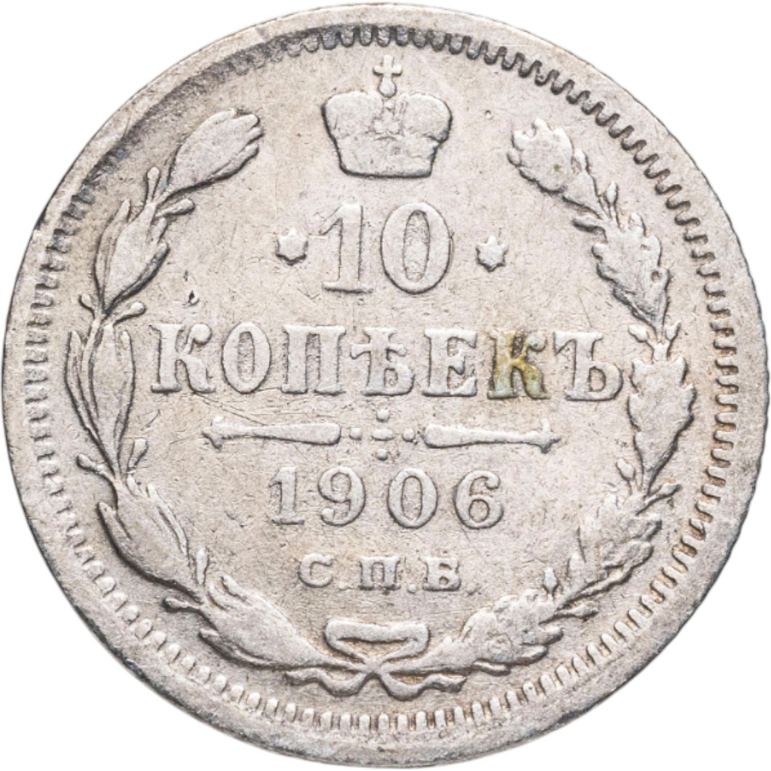 В центре указан номинал «10», ограниченный с обеих сторон звездочками. Над цифрой – Корона Российской империи. Под цифрой номинала — слово "КОПЕЕК". Ниже, расположен декоративный разделитель в виде двух разнонаправленных фигурных линий и стилизованным из точек крестом между ними. Под разделителем — дата выпуска монеты «1906». Под цифрой даты — обозначение монетного двора «С.П.Б.». Вдоль канта, не доходя до короны, изображен венок из лавровой и дубовой ветви, которые в нижней части перевязаны лентой на узел бантом. По окружности канта имеются рельефные элементы, выполненные в виде зубцов.