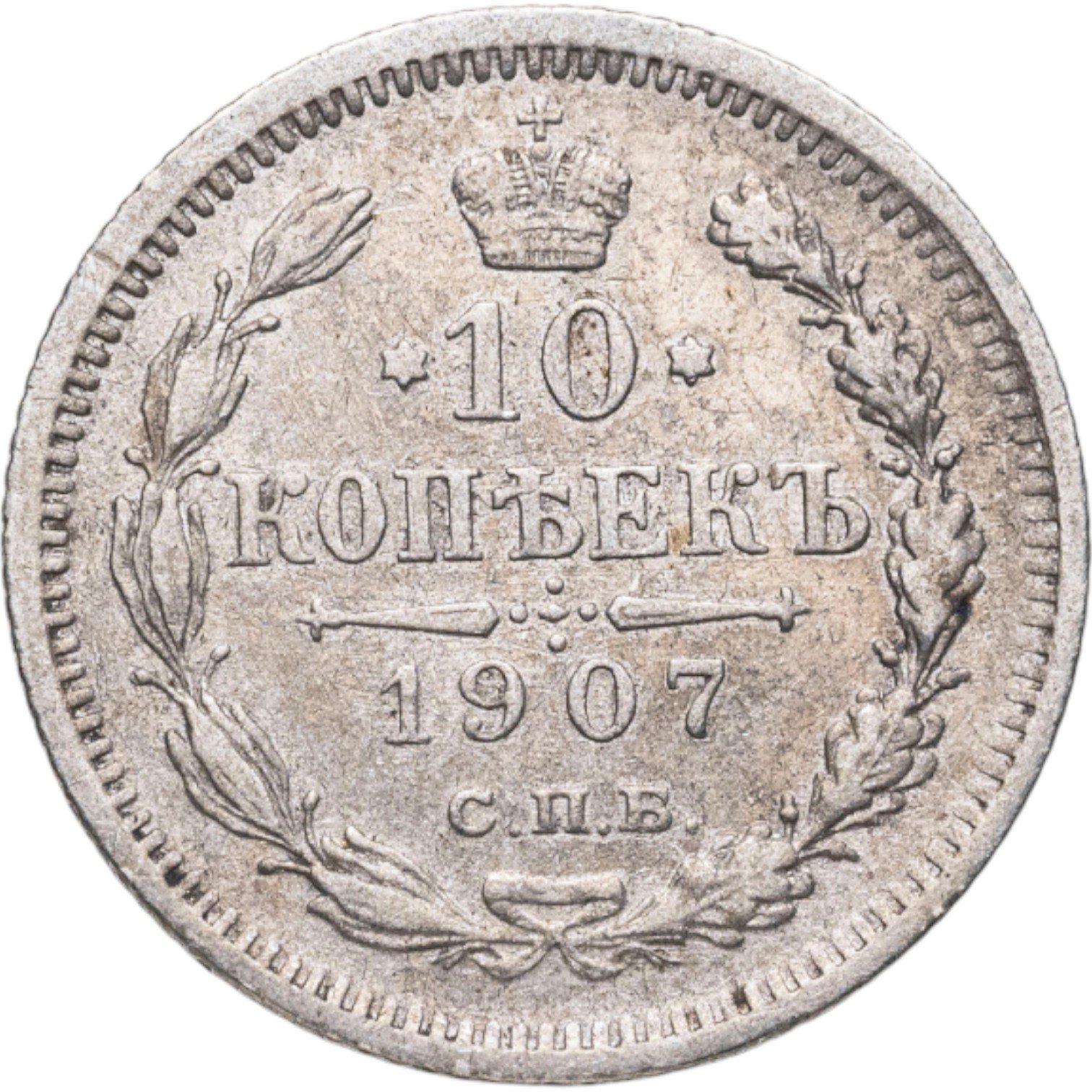 В центре указан номинал «10», ограниченный с обеих сторон звездочками. Над цифрой – Корона Российской империи. Под цифрой номинала — слово "КОПЕЕК". Ниже, расположен декоративный разделитель в виде двух разнонаправленных фигурных линий и стилизованным из точек крестом между ними. Под разделителем — дата выпуска монеты «1907». Под цифрой даты — обозначение монетного двора «С.П.Б.». Вдоль канта, не доходя до короны, изображен венок из лавровой и дубовой ветви, которые в нижней части перевязаны лентой на узел бантом. По окружности канта имеются рельефные элементы, выполненные в виде зубцов.