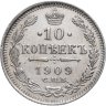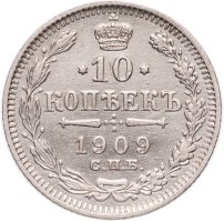 В центре указан номинал «10», ограниченный с обеих сторон звездочками. Над цифрой – Корона Российской империи. Под цифрой номинала — слово "КОПЕЕК". Ниже, расположен декоративный разделитель в виде двух разнонаправленных фигурных линий и стилизованным из точек крестом между ними. Под разделителем — дата выпуска монеты «1909». Под цифрой даты — обозначение монетного двора «С.П.Б.». Вдоль канта, не доходя до короны, изображен венок из лавровой и дубовой ветви, которые в нижней части перевязаны лентой на узел бантом. По окружности канта имеются рельефные элементы, выполненные в виде зубцов.