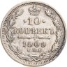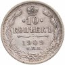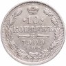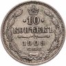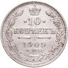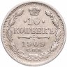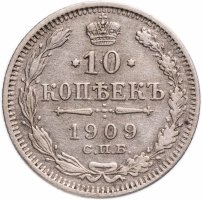 В центре указан номинал «10», ограниченный с обеих сторон звездочками. Над цифрой – Корона Российской империи. Под цифрой номинала — слово "КОПЕЕК". Ниже, расположен декоративный разделитель в виде двух разнонаправленных фигурных линий и стилизованным из точек крестом между ними. Под разделителем — дата выпуска монеты «1909». Под цифрой даты — обозначение монетного двора «С.П.Б.». Вдоль канта, не доходя до короны, изображен венок из лавровой и дубовой ветви, которые в нижней части перевязаны лентой на узел бантом. По окружности канта имеются рельефные элементы, выполненные в виде зубцов.