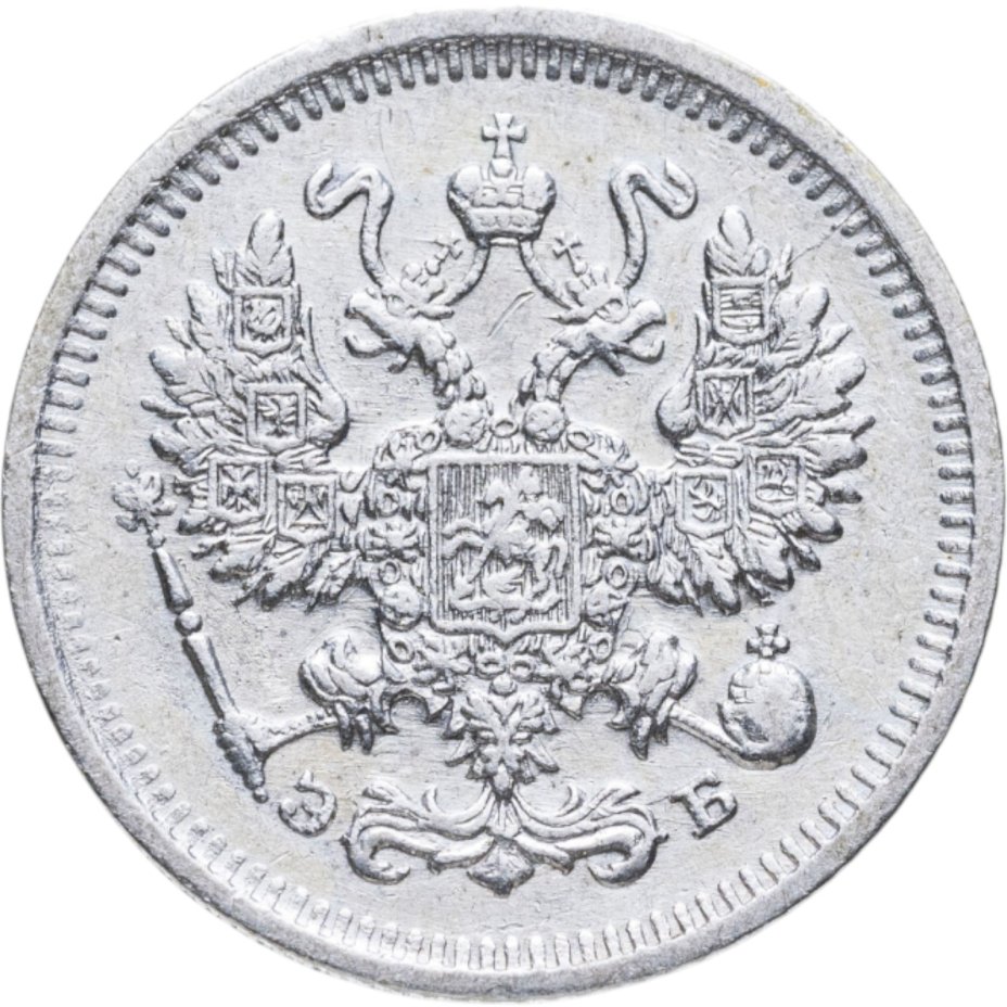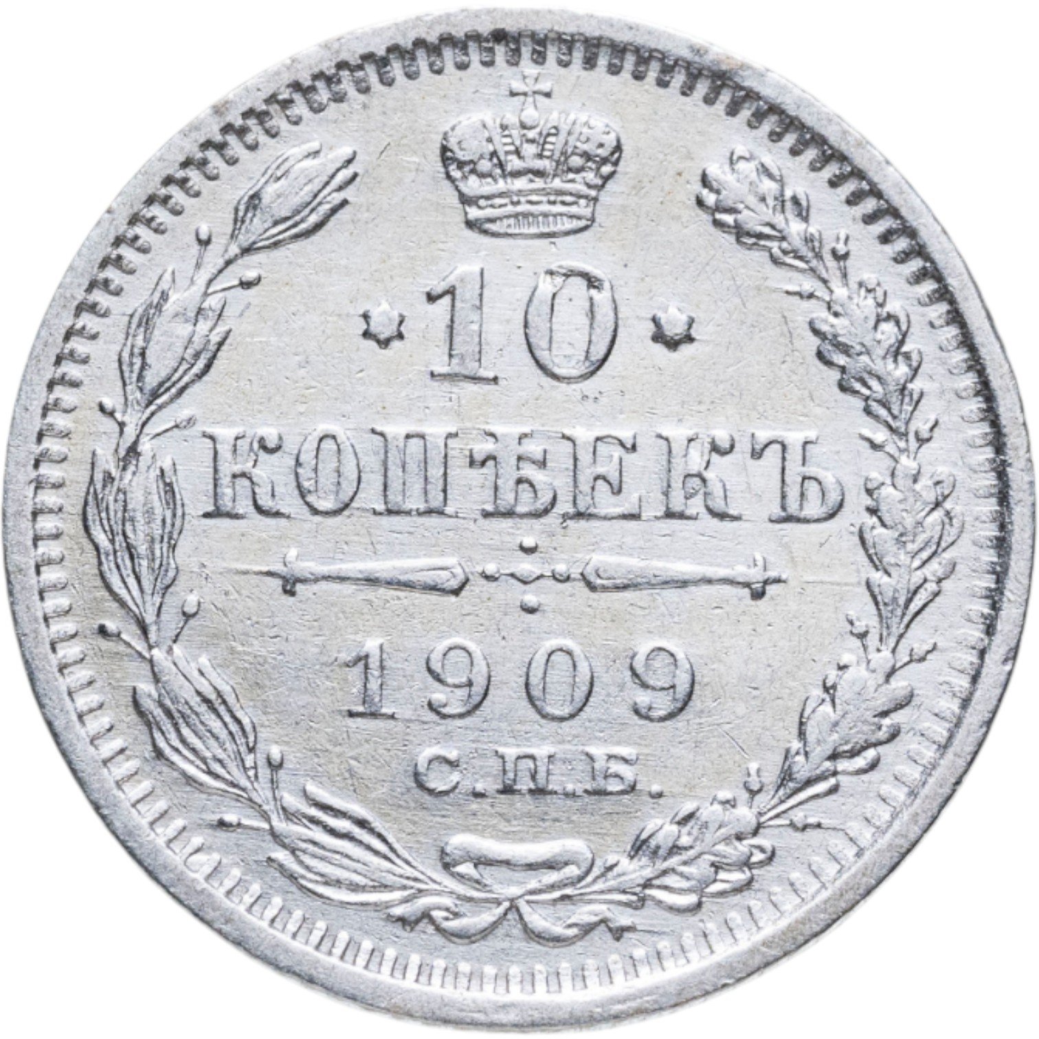 В центре указан номинал «10», ограниченный с обеих сторон звездочками. Над цифрой – Корона Российской империи. Под цифрой номинала — слово "КОПЕЕК". Ниже, расположен декоративный разделитель в виде двух разнонаправленных фигурных линий и стилизованным из точек крестом между ними. Под разделителем — дата выпуска монеты «1909». Под цифрой даты — обозначение монетного двора «С.П.Б.». Вдоль канта, не доходя до короны, изображен венок из лавровой и дубовой ветви, которые в нижней части перевязаны лентой на узел бантом. По окружности канта имеются рельефные элементы, выполненные в виде зубцов.
