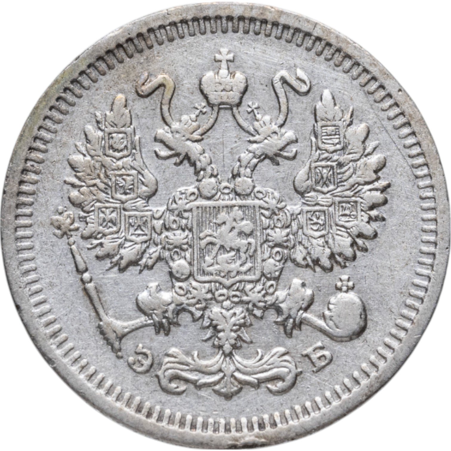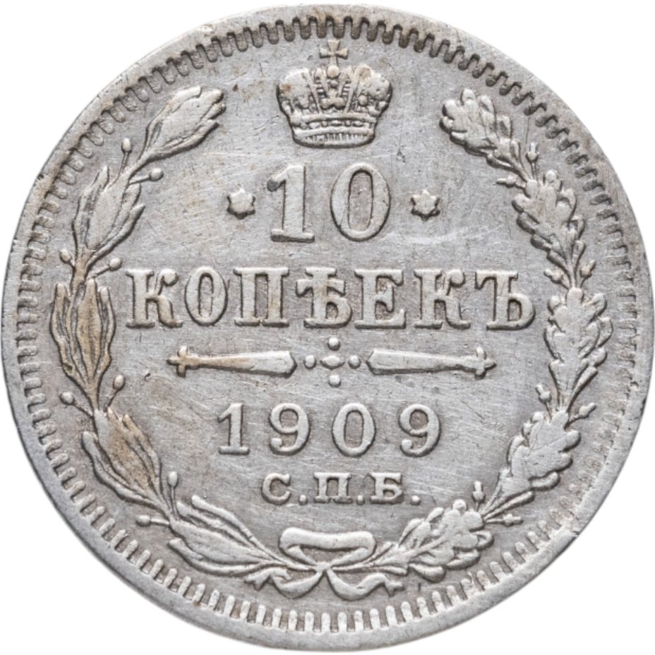 В центре указан номинал «10», ограниченный с обеих сторон звездочками. Над цифрой – Корона Российской империи. Под цифрой номинала — слово "КОПЕЕК". Ниже, расположен декоративный разделитель в виде двух разнонаправленных фигурных линий и стилизованным из точек крестом между ними. Под разделителем — дата выпуска монеты «1909». Под цифрой даты — обозначение монетного двора «С.П.Б.». Вдоль канта, не доходя до короны, изображен венок из лавровой и дубовой ветви, которые в нижней части перевязаны лентой на узел бантом. По окружности канта имеются рельефные элементы, выполненные в виде зубцов.