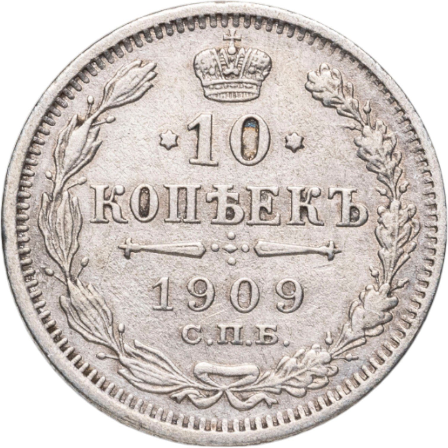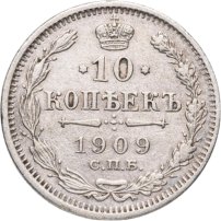 В центре указан номинал «10», ограниченный с обеих сторон звездочками. Над цифрой – Корона Российской империи. Под цифрой номинала — слово "КОПЕЕК". Ниже, расположен декоративный разделитель в виде двух разнонаправленных фигурных линий и стилизованным из точек крестом между ними. Под разделителем — дата выпуска монеты «1909». Под цифрой даты — обозначение монетного двора «С.П.Б.». Вдоль канта, не доходя до короны, изображен венок из лавровой и дубовой ветви, которые в нижней части перевязаны лентой на узел бантом. По окружности канта имеются рельефные элементы, выполненные в виде зубцов.