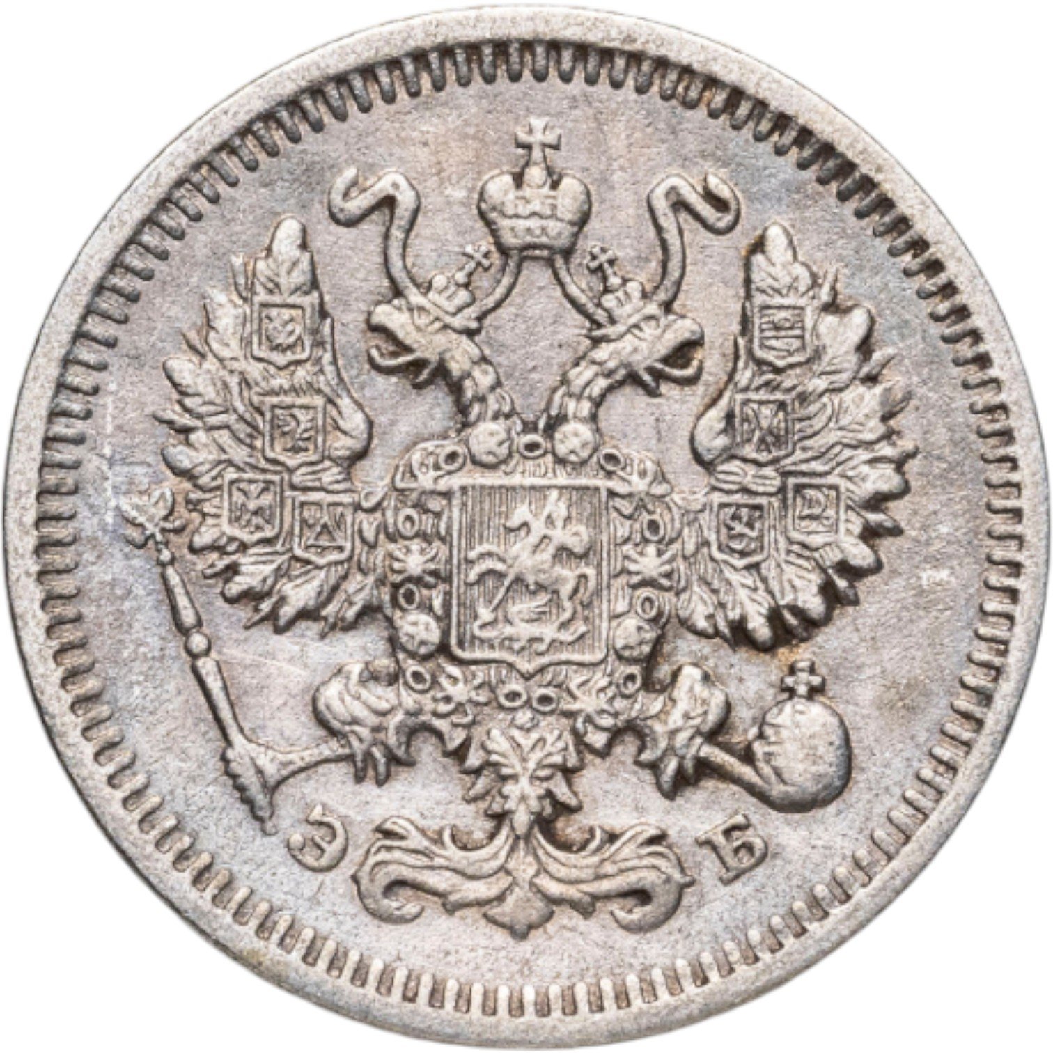 В центре изображен Малый Государственный Герб Российской империи - двуглавый орёл, головы которого увенчаны двумя коронами, третья, большая корона над ними. Все они соединены орденской лентой ордена Св. Апостола Андрея Первозванного. На груди орла расположен Московский герб, в щите изображен Георгий Победоносец с копьем поражающий дракона. Вокруг щита цепь ордена Св. Апостола Андрея Первозванного. На крыльях изображены гербы: Царства Казанского, Польского, Херсонеса Таврического, Астраханского, Сибирского, Грузинского и герб соединенных княжеств Киевского, Новгородского и Владимирского — по 4 на каждое крыло. В правой лапе орла – скипетр, в левой – держава. Под правой лапой – буква «Э», под левой – буква «Б». Инициалы минцмейстера Эликума Бабаянца. По окружности канта имеются рельефные элементы, выполненные в виде зубцов.