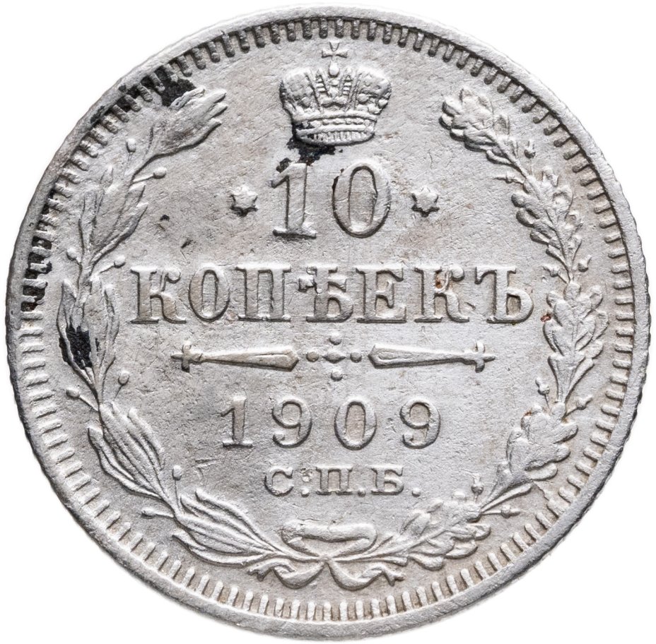 В центре указан номинал «10», ограниченный с обеих сторон звездочками. Над цифрой – Корона Российской империи. Под цифрой номинала — слово "КОПЕЕК". Ниже, расположен декоративный разделитель в виде двух разнонаправленных фигурных линий и стилизованным из точек крестом между ними. Под разделителем — дата выпуска монеты «1909». Под цифрой даты — обозначение монетного двора «С.П.Б.». Вдоль канта, не доходя до короны, изображен венок из лавровой и дубовой ветви, которые в нижней части перевязаны лентой на узел бантом. По окружности канта имеются рельефные элементы, выполненные в виде зубцов.