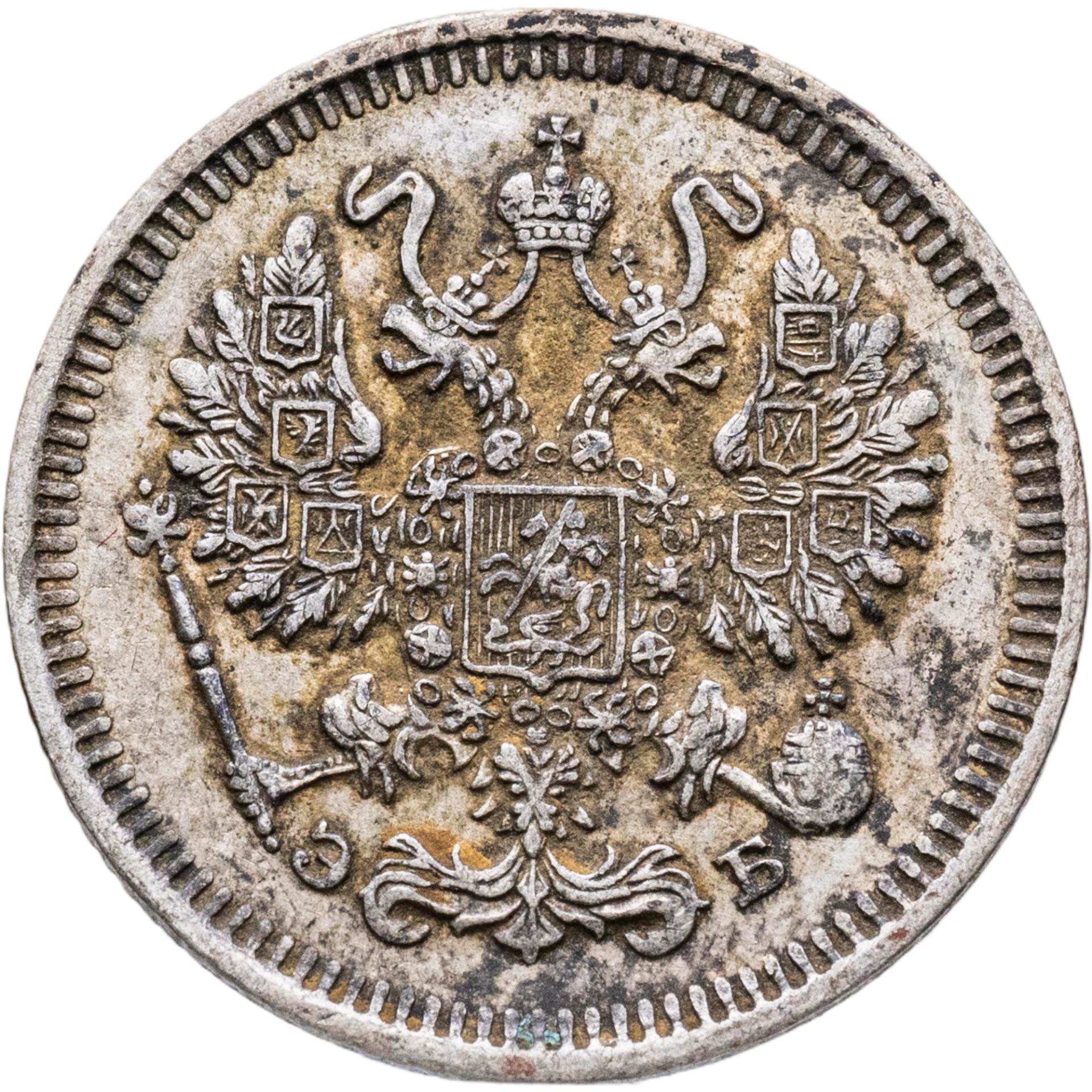В центре изображен Малый Государственный Герб Российской империи - двуглавый орёл, головы которого увенчаны двумя коронами, третья, большая корона над ними. Все они соединены орденской лентой ордена Св. Апостола Андрея Первозванного. На груди орла расположен Московский герб, в щите изображен Георгий Победоносец с копьем поражающий дракона. Вокруг щита цепь ордена Св. Апостола Андрея Первозванного. На крыльях изображены гербы: Царства Казанского, Польского, Херсонеса Таврического, Астраханского, Сибирского, Грузинского и герб соединенных княжеств Киевского, Новгородского и Владимирского — по 4 на каждое крыло. В правой лапе орла – скипетр, в левой – держава. Под правой лапой – буква «Э», под левой – буква «Б». Инициалы минцмейстера Эликума Бабаянца. По окружности канта имеются рельефные элементы, выполненные в виде зубцов.