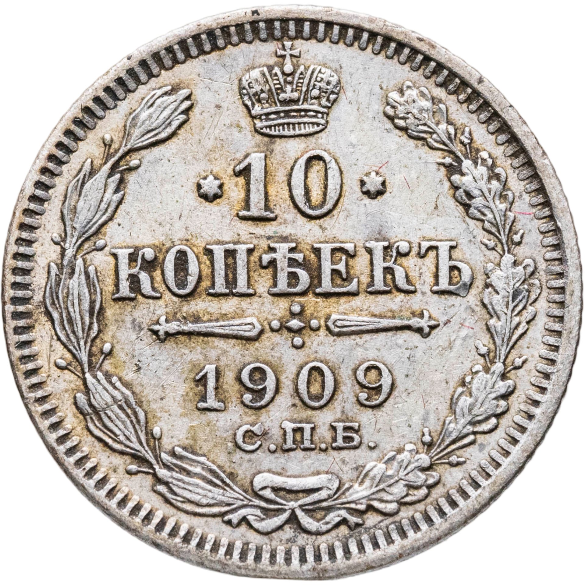 В центре указан номинал «10», ограниченный с обеих сторон звездочками. Над цифрой – Корона Российской империи. Под цифрой номинала — слово "КОПЕЕК". Ниже, расположен декоративный разделитель в виде двух разнонаправленных фигурных линий и стилизованным из точек крестом между ними. Под разделителем — дата выпуска монеты «1909». Под цифрой даты — обозначение монетного двора «С.П.Б.». Вдоль канта, не доходя до короны, изображен венок из лавровой и дубовой ветви, которые в нижней части перевязаны лентой на узел бантом. По окружности канта имеются рельефные элементы, выполненные в виде зубцов.