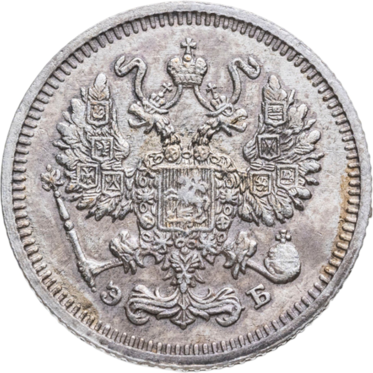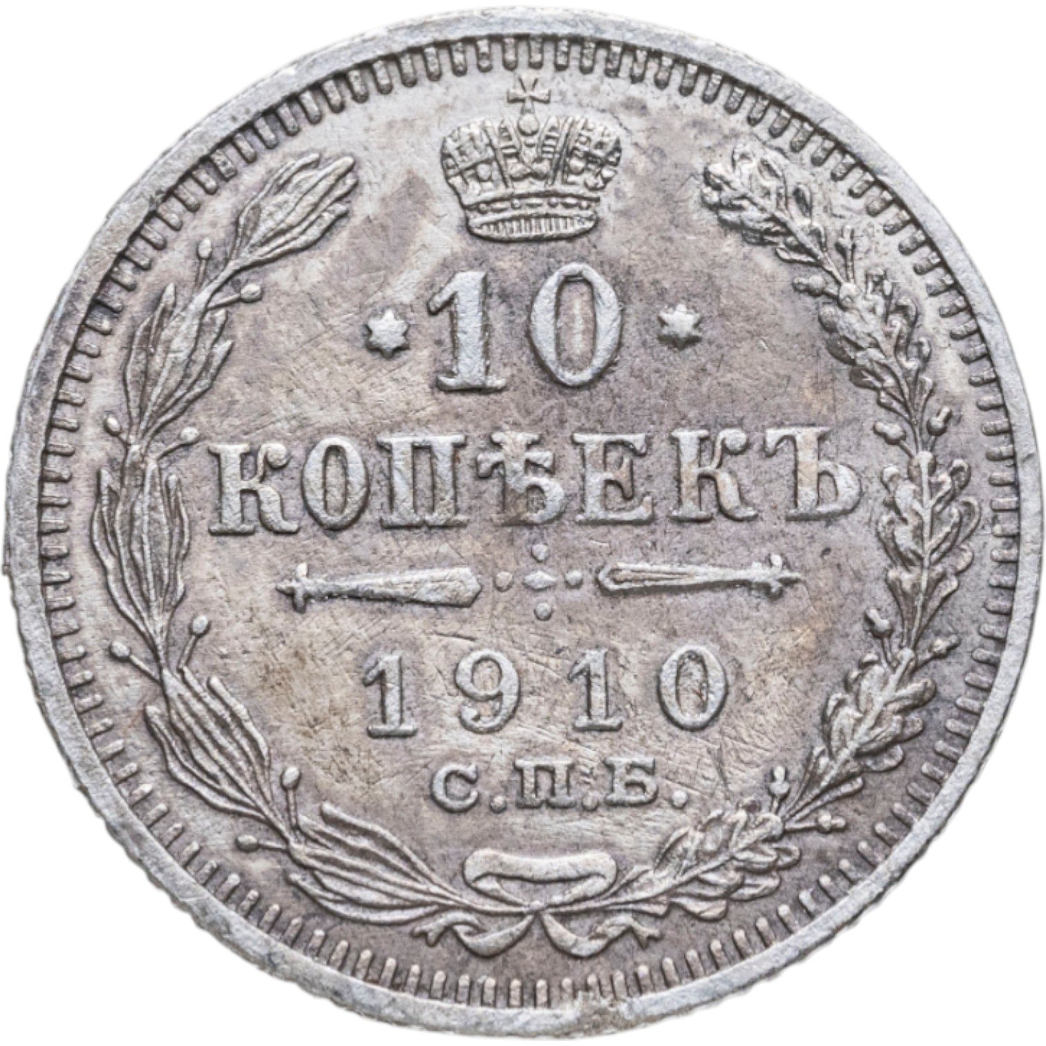 В центре указан номинал «10», ограниченный с обеих сторон звездочками. Над цифрой – Корона Российской империи. Под цифрой номинала — слово "КОПЕЕК". Ниже, расположен декоративный разделитель в виде двух разнонаправленных фигурных линий и стилизованным из точек крестом между ними. Под разделителем — дата выпуска монеты «1910». Под цифрой даты — обозначение монетного двора «С.П.Б.». Вдоль канта, не доходя до короны, изображен венок из лавровой и дубовой ветви, которые в нижней части перевязаны лентой на узел бантом. По окружности канта имеются рельефные элементы, выполненные в виде зубцов.